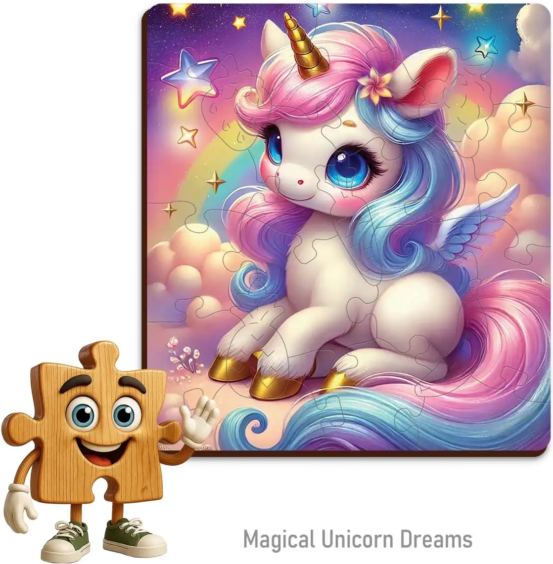 Dieses Set ist ein tolles Geschenk für Kinder, die Einhörner lieben und mit einem hochwertigen Holzpuzzle von WOODEN CITY das Puzzeln trainieren möchten.
