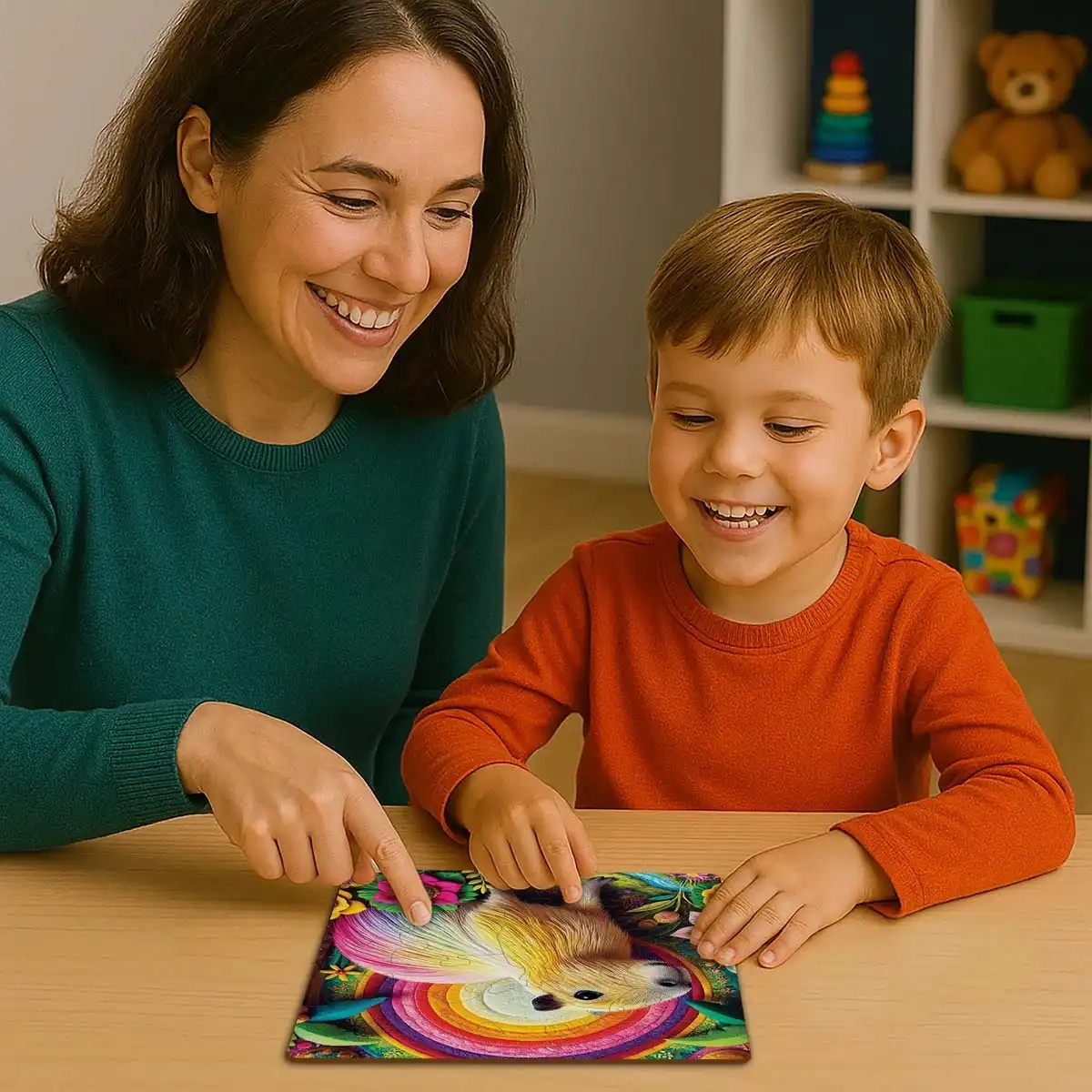 Holzpuzzles fördern die Feinmotorik, das räumliche Vorstellungsvermögen und Geduld. Das kompakte Format des fertigen Bildes passt ins Regal oder in einen Rahmen, sodass Sie das Ergebnis gemeinsam mit Ihren Kindern ausstellen können.