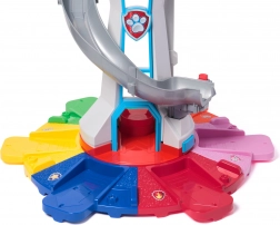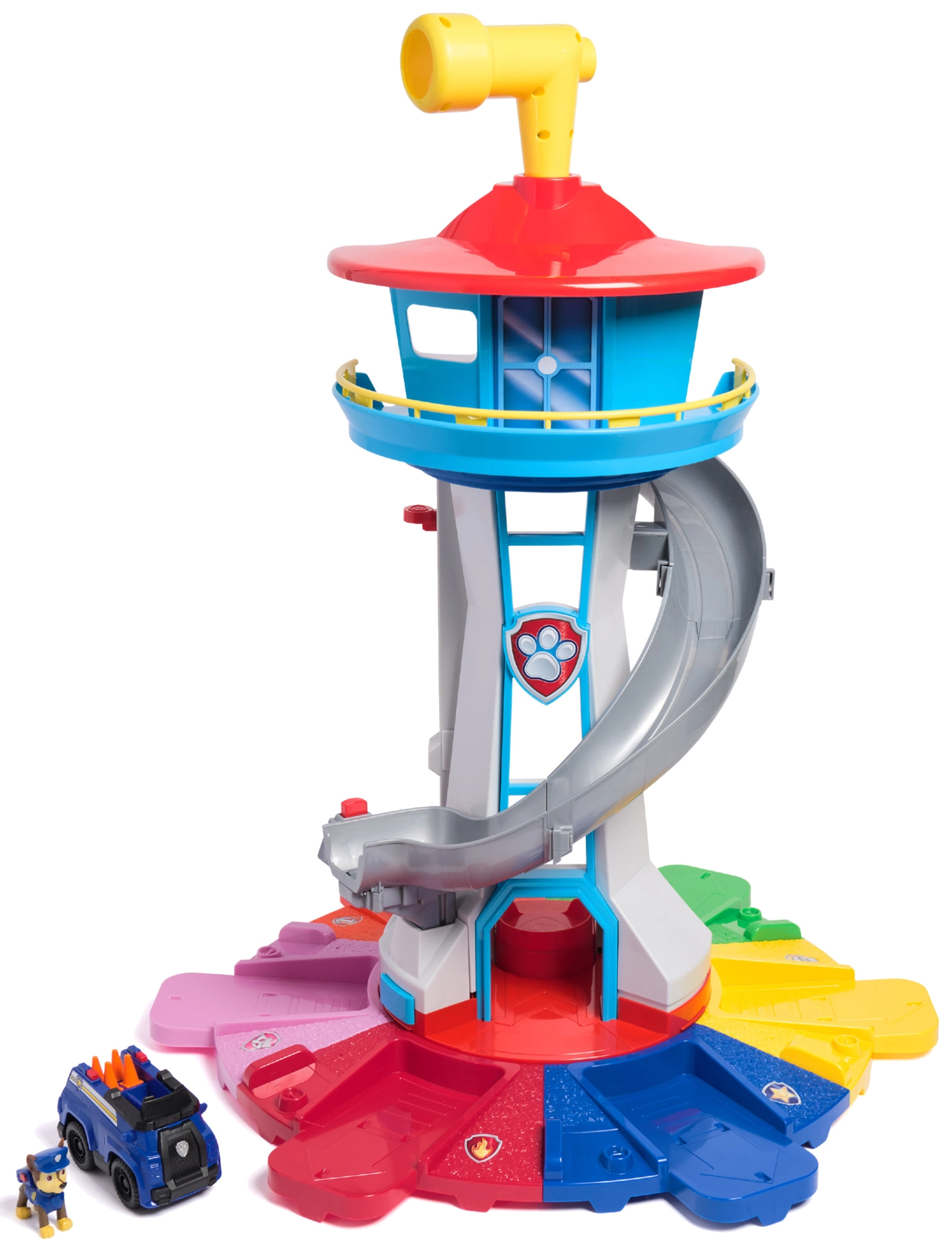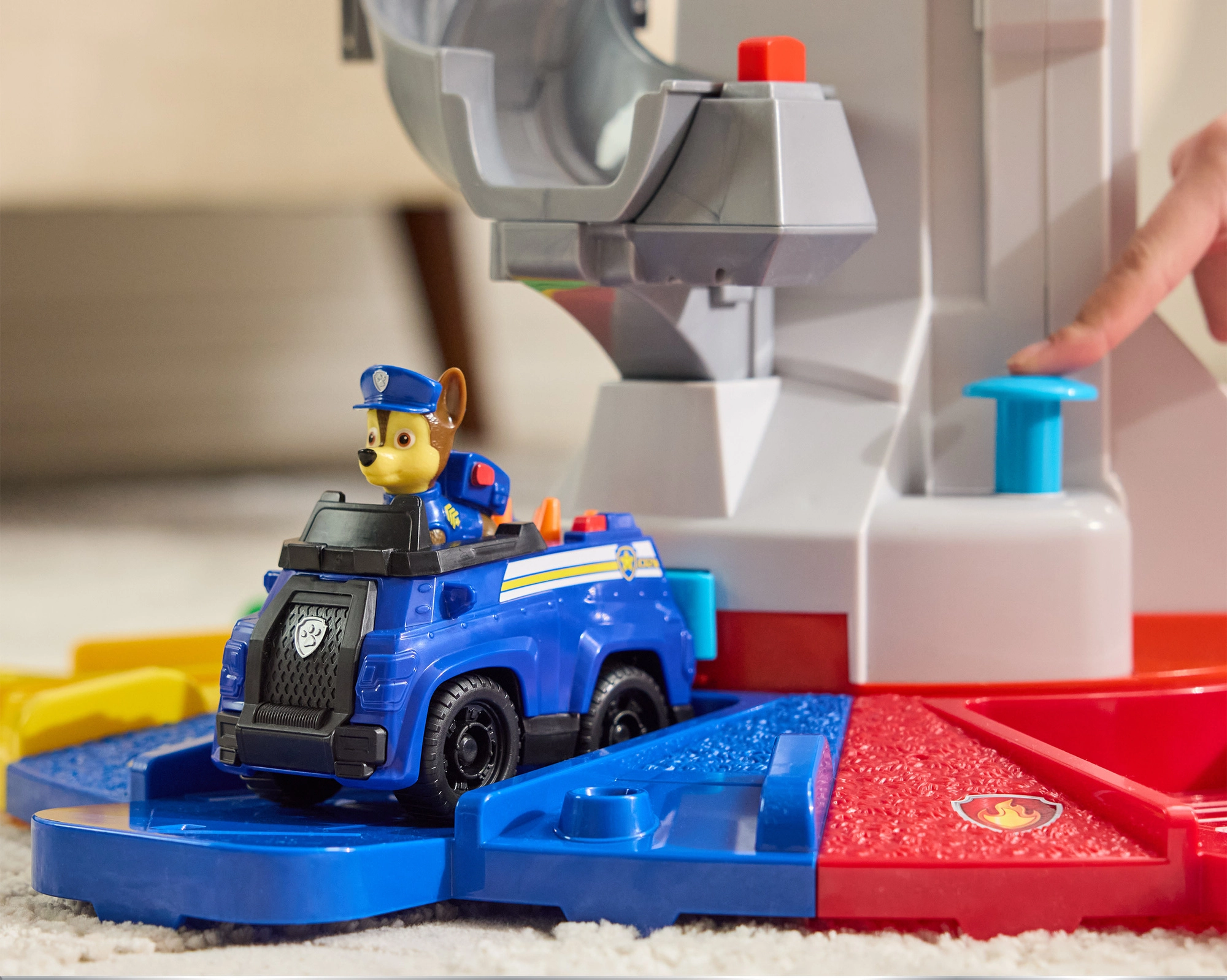 Die ikonische Basis aus PAW PATROL bietet Kindern endlose Spielmöglichkeiten. Nach der Missionswahl über das Bedienfeld mit Tasten und Effekten fährt man Chase mit dem Aufzug nach oben, schaut sich mit dem drehbaren Periskop um und startet die heldenhafte Rettungsaktion über die breite Rutsche direkt zur drehbaren Abschussrampe.