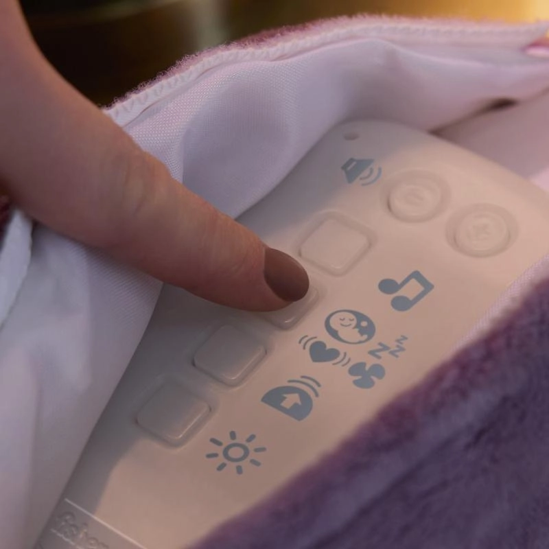 Sanft leuchtender Bauch und eine Auswahl an Melodien, Naturgeräuschen und Weißem Rauschen helfen Ihrem Kind, sich zu beruhigen und besser einzuschlafen.