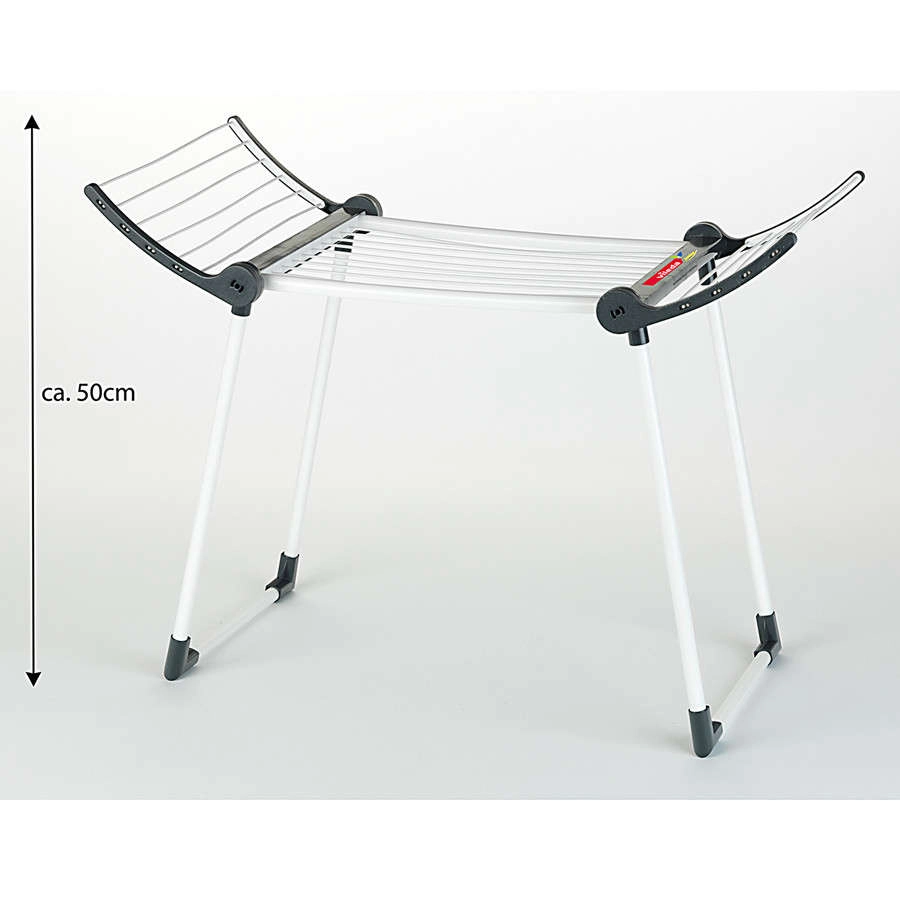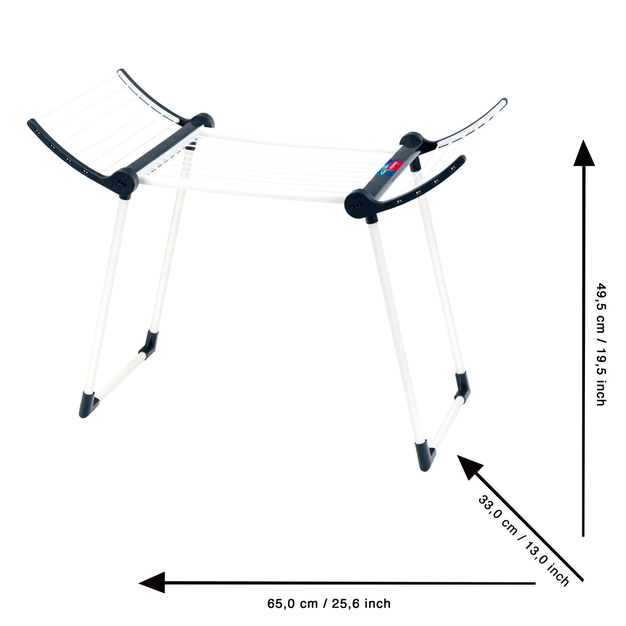 Die Konstruktion ist dank der Doppelfüße robust und stabil, der Trockner ist in Weiß mit schwarzen Elementen gehalten und verfügt über zwei klappbare Seiten für zusätzliche Trockenfläche. Nach dem Spielen lässt er sich kompakt zusammenklappen und spart so Platz im Kinderzimmer.