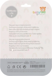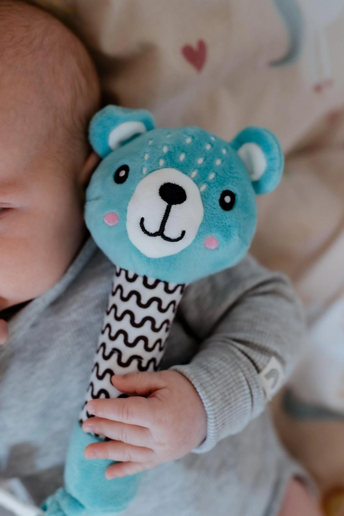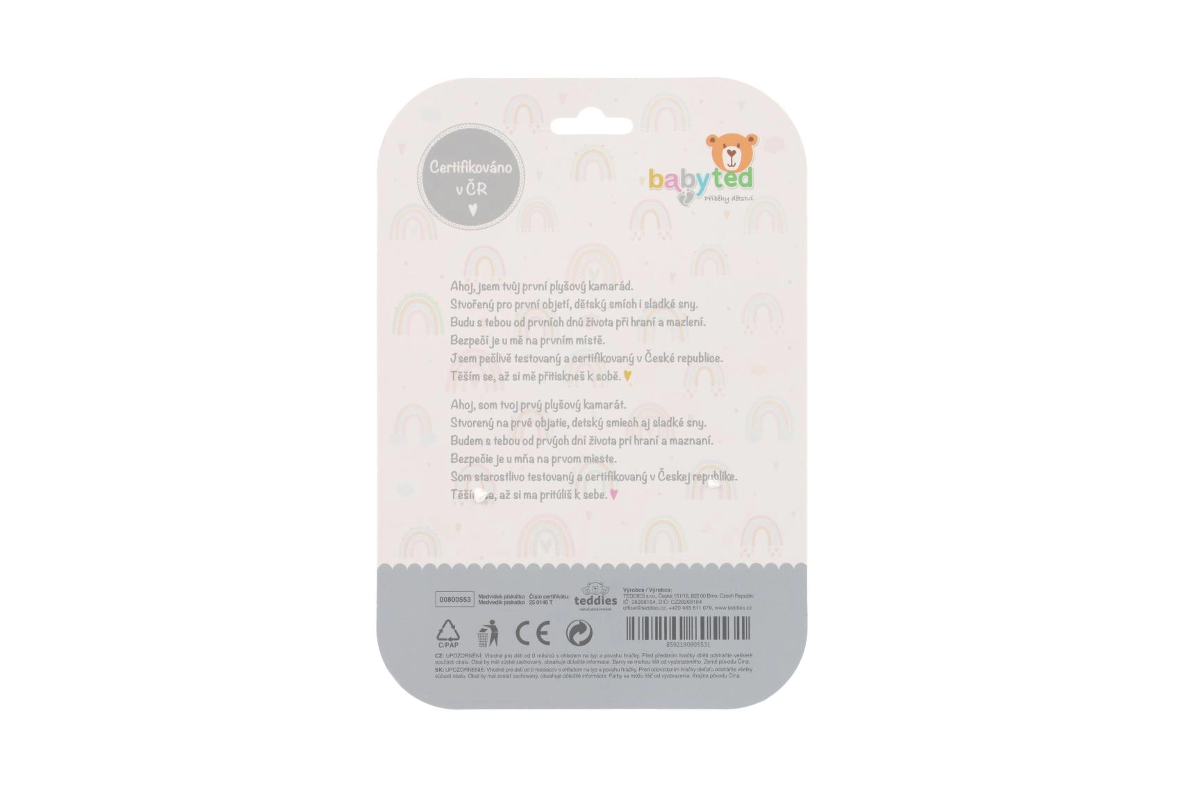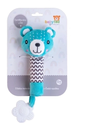 Das niedliche Plüsch-Quietschspielzeug mit Bär von BABYTED ist das ideale erste Spielzeug für Babys ab 0 M+. Dank des langen, weichen Griffs liegt es perfekt in kleinen Händchen, beim Drücken quietscht es sanft und fördert das Hörvermögen. Am Ende befindet sich ein weicher Beißring in Blumenform, der empfindliches Zahnfleisch beruhigt. Kuscheliges, sicheres Plüschmaterial und kontrastreiche Muster unterstützen die visuelle und sensorische Entwicklung. Das Spielzeug ist in Tschechien zertifiziert und erfüllt strenge Sicherheitsnormen.
