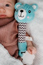 Dank der kontrastreichen Muster am Körper des Bären unterstützt das Spielzeug die visuelle Wahrnehmung und Konzentration. Für Sicherheit sorgen die sorgfältige Verarbeitung, die Zertifizierung in Tschechien und hautfreundliche Materialien.