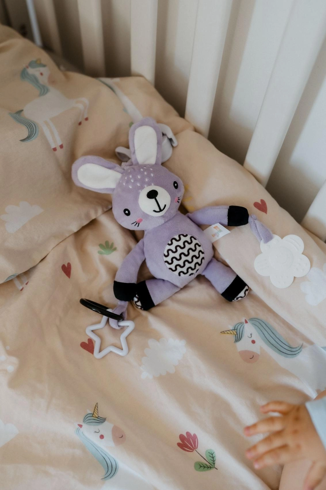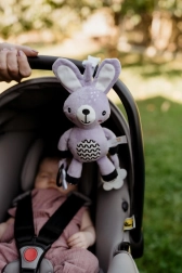 Dieser flauschige Hängehase wird der erste Freund Ihres Babys – zu Hause und unterwegs. Dank des universellen Clips lässt er sich leicht am Kinderwagen, Autositz, Bettchen oder Spielbogen befestigen. Der weiche Plüschkörper lädt zum Kuscheln ein, während rasselnde Ohren und kontrastreiche Details die visuelle und auditive Wahrnehmung fördern.