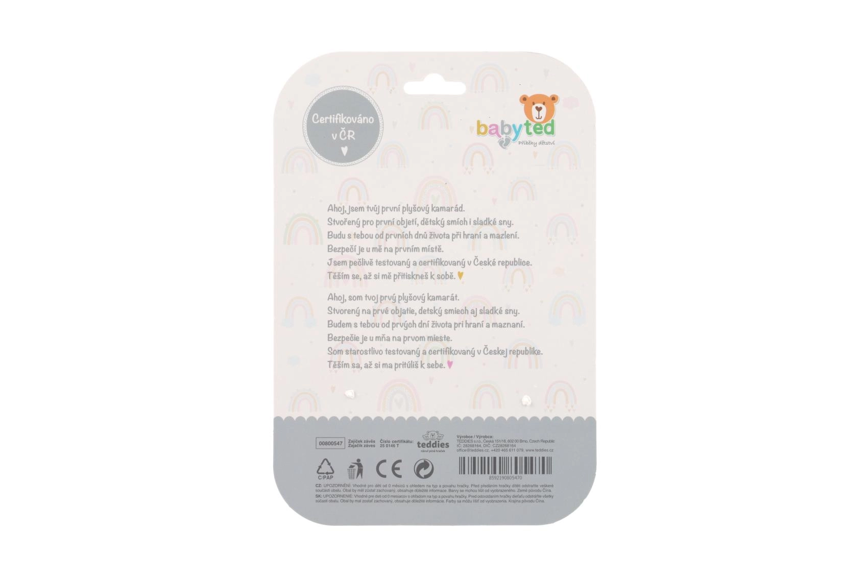 An den Pfotenenden finden Sie sichere Kunststoffformen – einen Stern und eine Blume. Diese dienen als Beißringe und helfen, den Griff sowie die Handkoordination zu trainieren. Das Spielzeug ist in der Tschechischen Republik zertifiziert und für Kinder ab der Geburt geeignet.