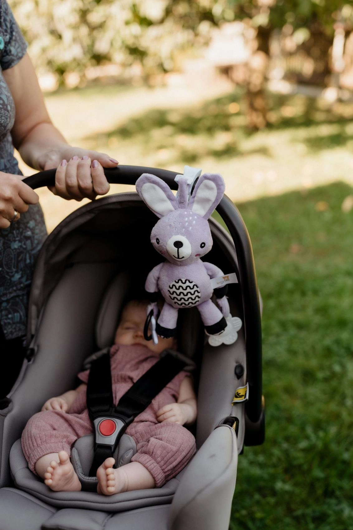 Praktischer Clip zur schnellen Befestigung am Kinderwagen, Autositz, Bettchen oder Spielbogen – Unterhaltung und Beruhigung jederzeit griffbereit.