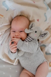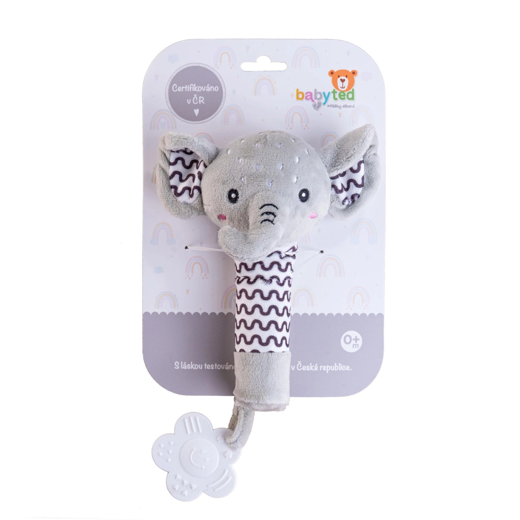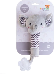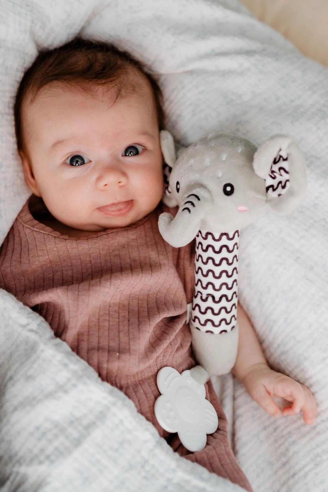 Der Plüschelefant mit Quietsche und Beißteil ist das ideale erste Spielzeug für Neugeborene. Dank der ergonomischen, länglichen Form lässt er sich auch von kleinen Händchen leicht halten, das sanfte Quietschen stimuliert das Gehör und zieht die Aufmerksamkeit des Babys auf sich. Weiches, sicheres Material bietet eine angenehme Haptik und ein beruhigendes Gefühl beim Kuscheln.