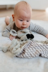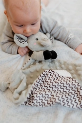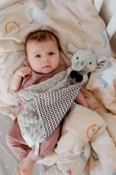 Die integrierte Rassel klingt sanft und fördert das Hörvermögen, während das weiche Silikon-Beißteil empfindliches Zahnfleisch beim Durchbruch der ersten Zähnchen beruhigt. Das Schmusetuch ist ideal zum Schlafen, für den Kinderwagen und für unterwegs.