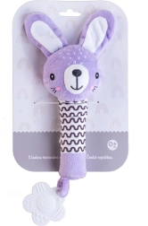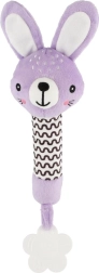 Der lilafarbene Plüschhase ist ein ideales erstes Spielzeug für Neugeborene. Die leichte Konstruktion und der lange, weiche Körper liegen hervorragend in kleinen Händchen; beim Drücken erzeugt er ein sanftes Quietschgeräusch, das natürlich die Aufmerksamkeit des Babys weckt und die Geräuschwahrnehmung fördert.