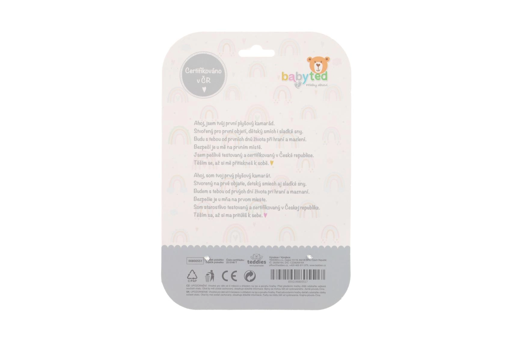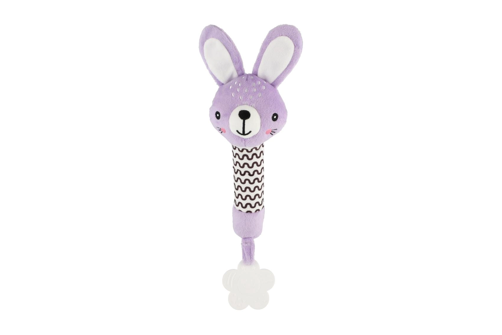 Das niedliche quietschende Plüschtier in Hasenform mit weichem Beißring erfreut Babys ab der Geburt. Dank des länglichen, leicht greifbaren Körpers und dem sanften Quietschen unterstützt es die hörbare Entwicklung, während kontrastreiche Schwarz-Weiß-Muster den Sehsinn stimulieren. Der weiche Blumen-Beißring lindert empfindliches Zahnfleisch beim Zahnen. Hergestellt aus weichem und sicherem Plüsch, geeignet für die Kleinsten. Zertifizierung in Tschechien garantiert Sicherheit und Qualität.