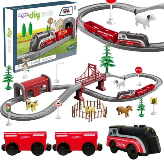 Zum umfangreichen Zubehör gehören Figuren von Pferd, Hund, Widder und Kuh, außerdem Bäume, Zäune und Verkehrszeichen. Kinder können verschiedene Streckenvarianten aufbauen und so räumliches Denken, Selbstständigkeit und Motorik fördern. Hochwertige Verarbeitung und kräftige Farben unterstützen sicheres und anregendes Spiel.