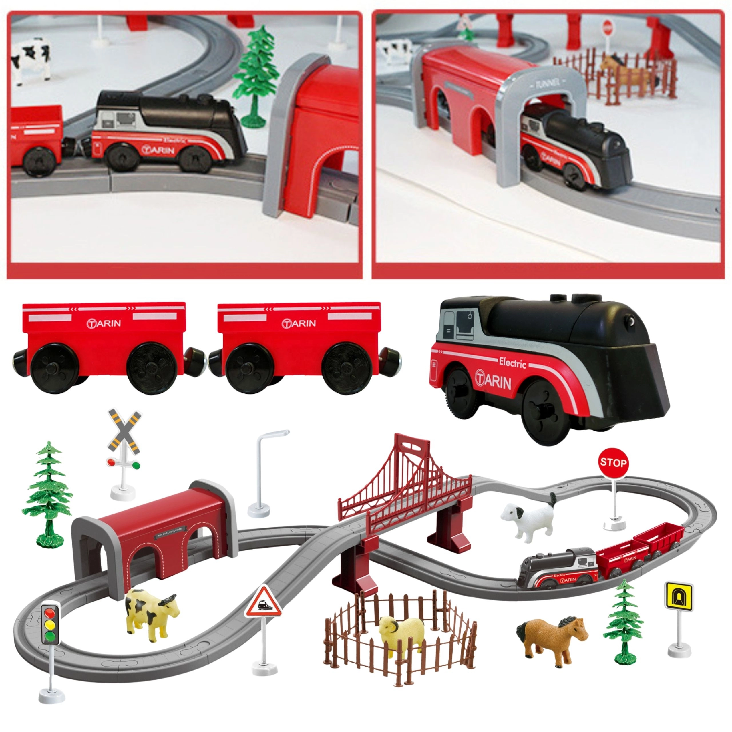 Diese elektrische WOOPIE-Eisenbahn bietet Kindern ab 3 Jahren stundenlangen kreativen Spielspaß. Dank magnetischer Kupplungen lassen sich die Waggons leicht und sicher verbinden, die AAA-betriebene Lok sorgt für realistische Bewegung und die Strecke mit Brücke und Tunnel schafft eine attraktive Bauernhofszenerie.