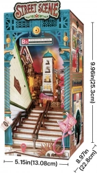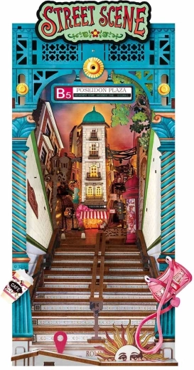 Dieses DIY-Set aus der ROLIFE Book Nook-Reihe verwandelt Ihr Bücherregal in eine malerische Stadtgasse. Der obere Teil der Szene bietet einen Blick auf Straßenniveau – Lampen, Schilder, Pflastersteine und leuchtende Fenster fehlen nicht. Unten an der Treppe entdecken Sie kleine Requisiten des Stadtlebens wie einen Papp-Kaffeebecher oder eine rosa Handtasche sowie für Reisefans ein Sonnensymbol und einen Karten-Pin. Beim Einschieben ins Regal überrascht ein cleveres Element: Unter der Treppe verbirgt sich ein Mini-Bahnhof, der beim Herausziehen sichtbar wird.