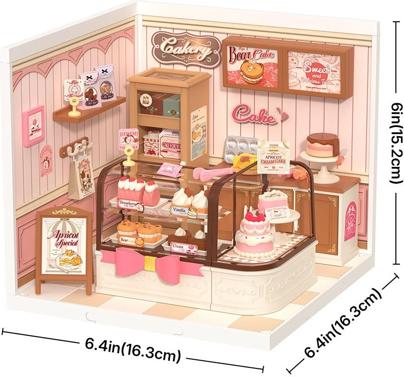 Entdecken Sie den Zauber einer Miniatur-Konditorei mit Törtchen, Rouladen und Schichtdesserts, die zum Anbeißen aussehen. Im Mittelpunkt stehen Glasvitrinen und zwei Theken – eine gerade und eine elegant geschwungene – mit ausgestellten Cupcakes und Macarons samt farbigen Schildern. Eine Zange für die Ausgabe fehlt ebenso wenig wie weitere Leckereien im hinteren Bereich, die die authentische Atmosphäre abrunden.