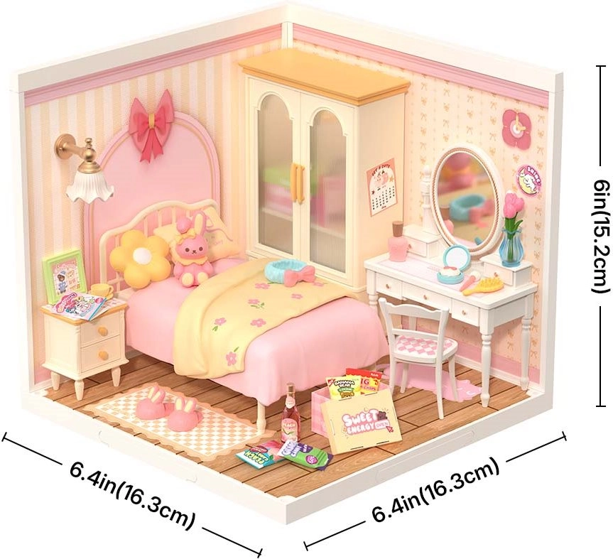 Das Set ist für einfaches Zusammenbauen konzipiert, mit einem Schwierigkeitsgrad von 1/5 und einer ungefähren Bauzeit von rund 1 Stunde. Beim Basteln genießen Sie die Arbeit mit kleinen Komponenten, und das Ergebnis ist ein bezauberndes Mini-Diorama eines Schlafzimmers, das sich perfekt als Dekoration für Regal, Schreibtisch oder Vitrine eignet.