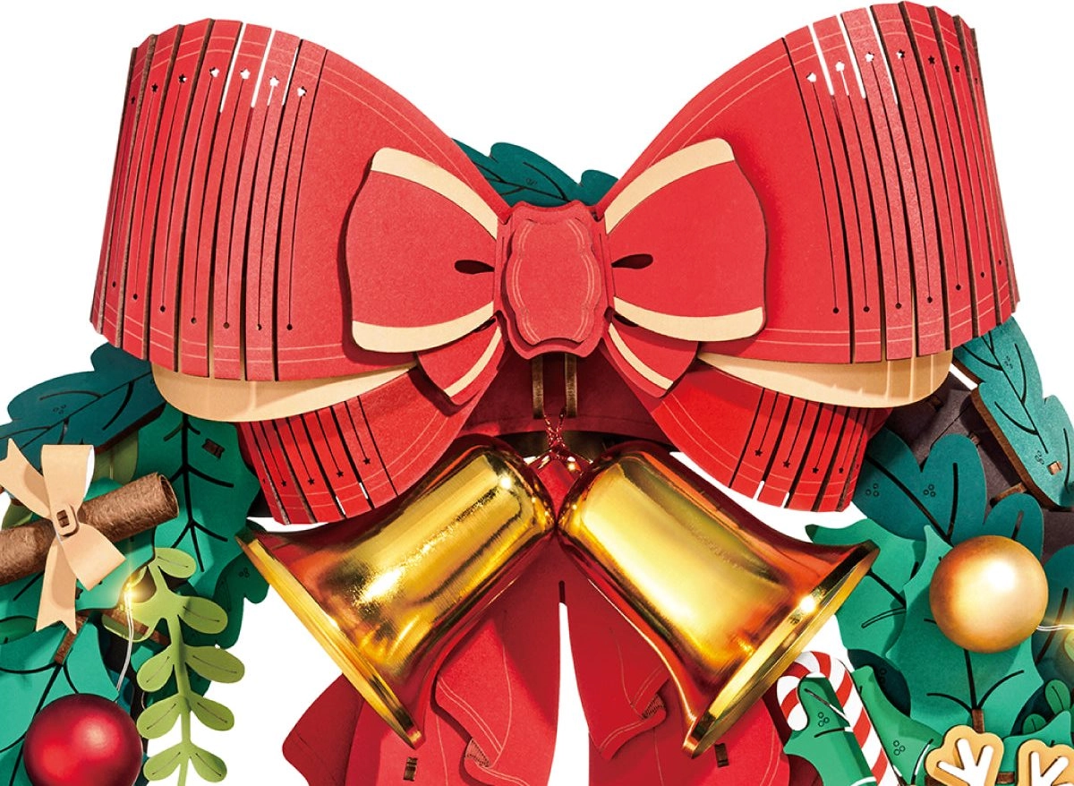 Dieser elegante Weihnachtskranz verbindet traditionelle Motive mit modernem DIY-Spaß. Grüne Zweige werden ergänzt durch Deko wie Stechpalme, Beeren, Zapfen, Schneeflocken, Lebkuchen, Geschenke und die ikonische große rote Schleife mit goldenen Glöckchen. Integrierte LEDs verstärken die festliche Stimmung und verwandeln das fertige Modell in eine einzigartige Dekoration für Tür oder Wand.
