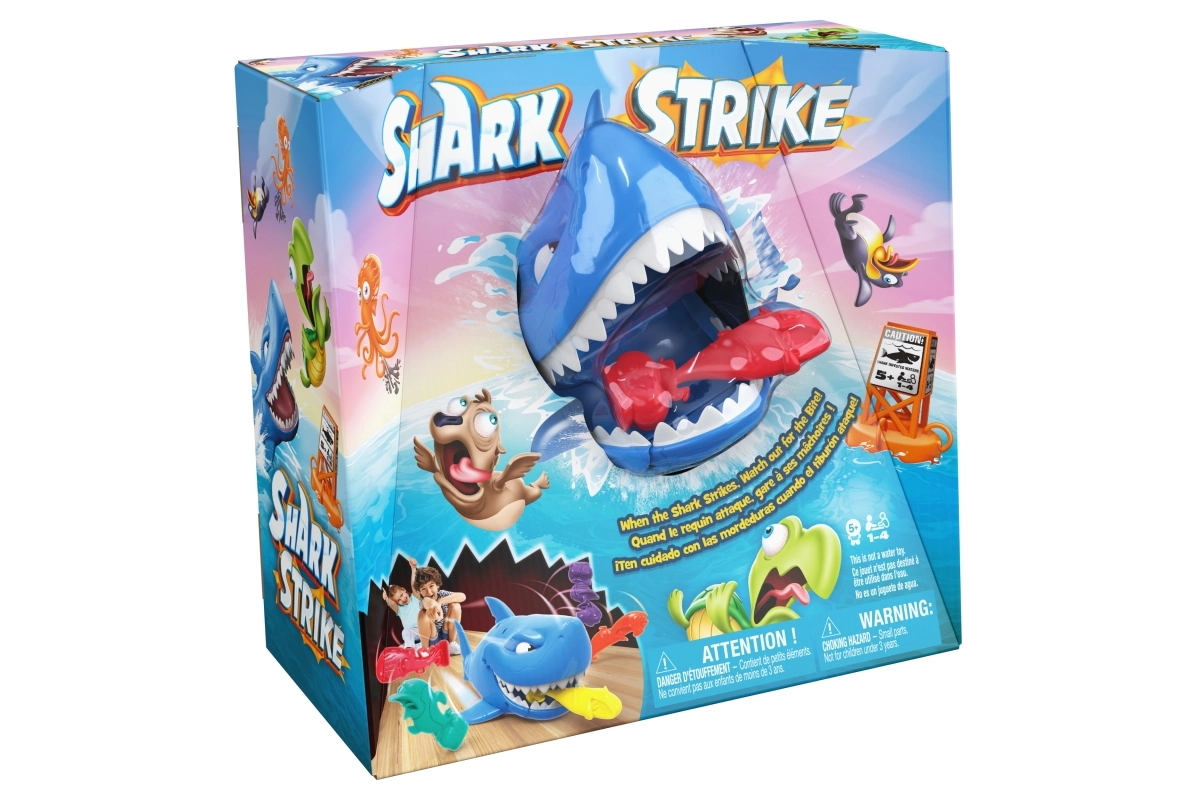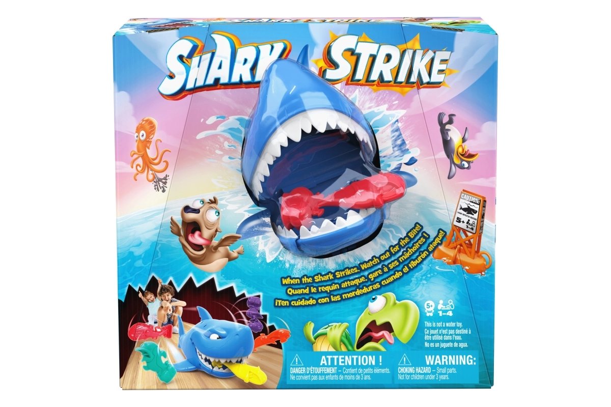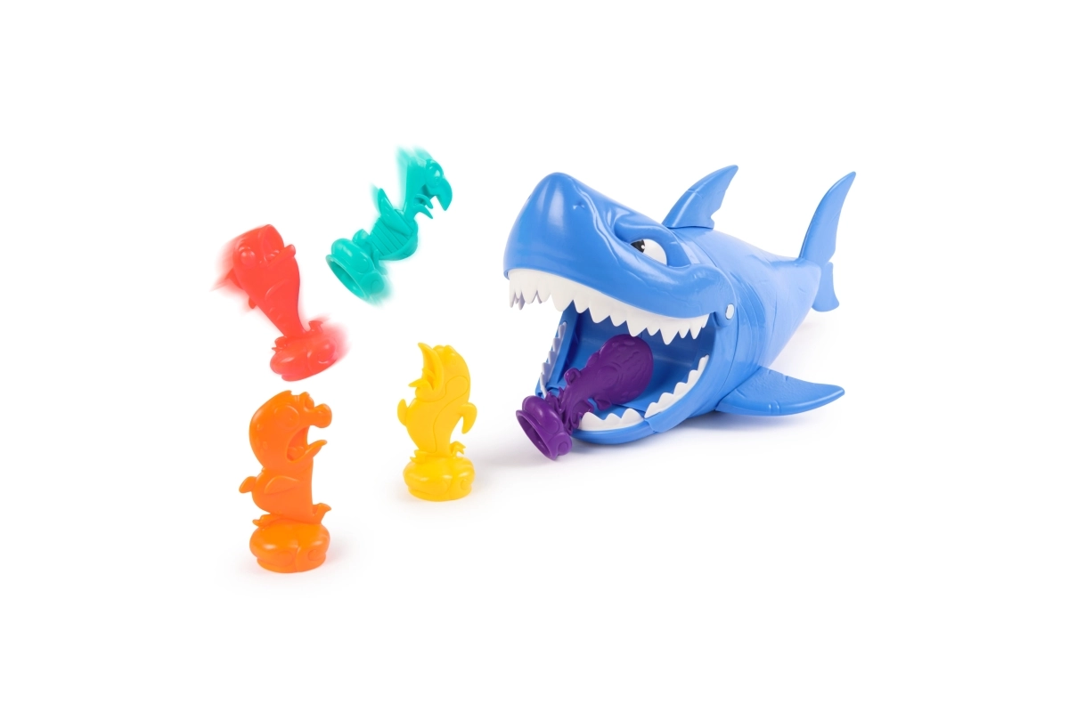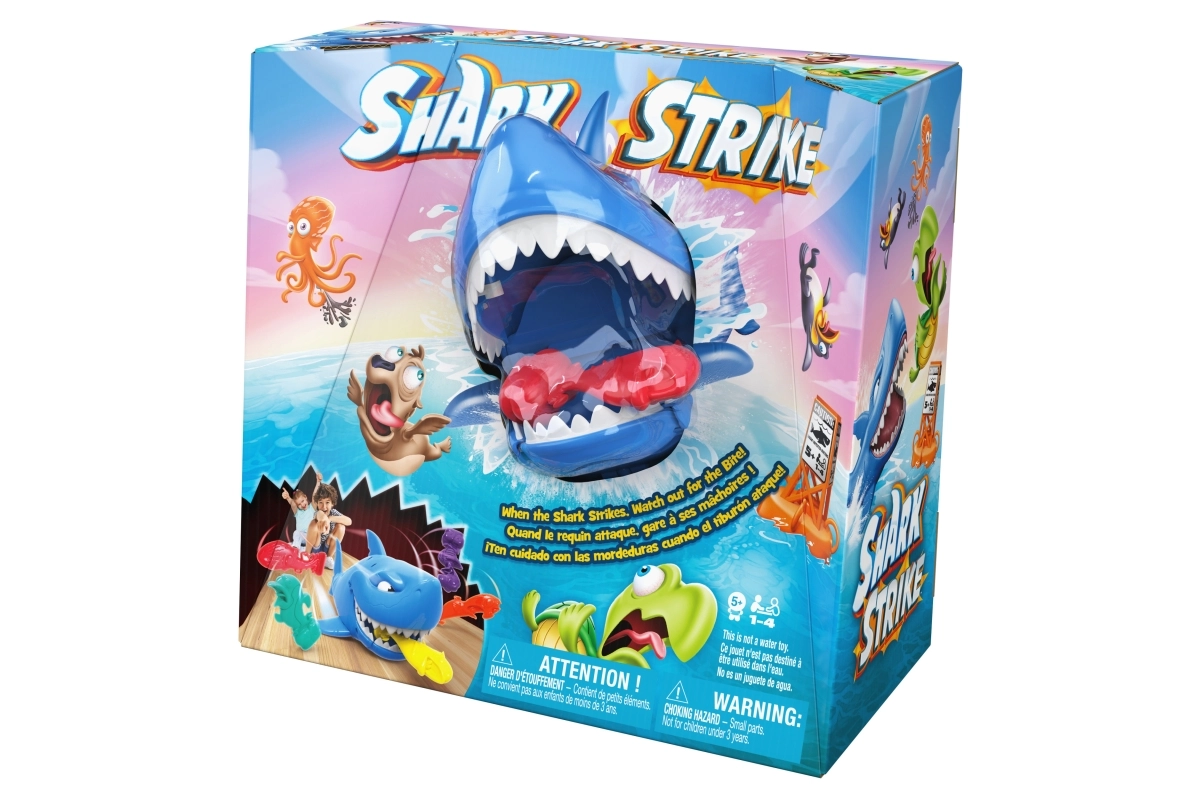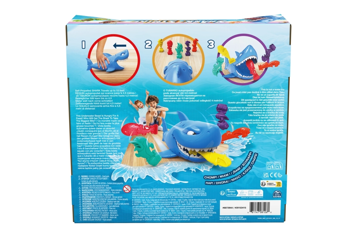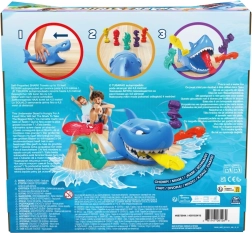 Lass den Hai los, ziele auf die Fische des Gegners und erlebe jede Menge Spaß! Die Spieler stellen ihre bunten Figuren auf den Boden, der Jüngere beginnt, spannt den Hai und schickt ihn los. Ziel ist es, in drei Versuchen möglichst viele Fische des Gegners zu schnappen – wer mehr erwischt, gewinnt.