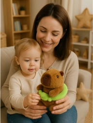 Diese braune Plüsch-Kapibara ist aus weichem, hochwertigem Plüsch gefertigt und mit hypoallergenem Material gefüllt – für maximalen Komfort und Sicherheit beim Spielen und Schlafen. Der abnehmbare grüne Ring mit lächelndem Frosch fördert kreatives Spiel und regt die Fantasie von Kindern an.