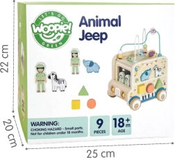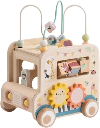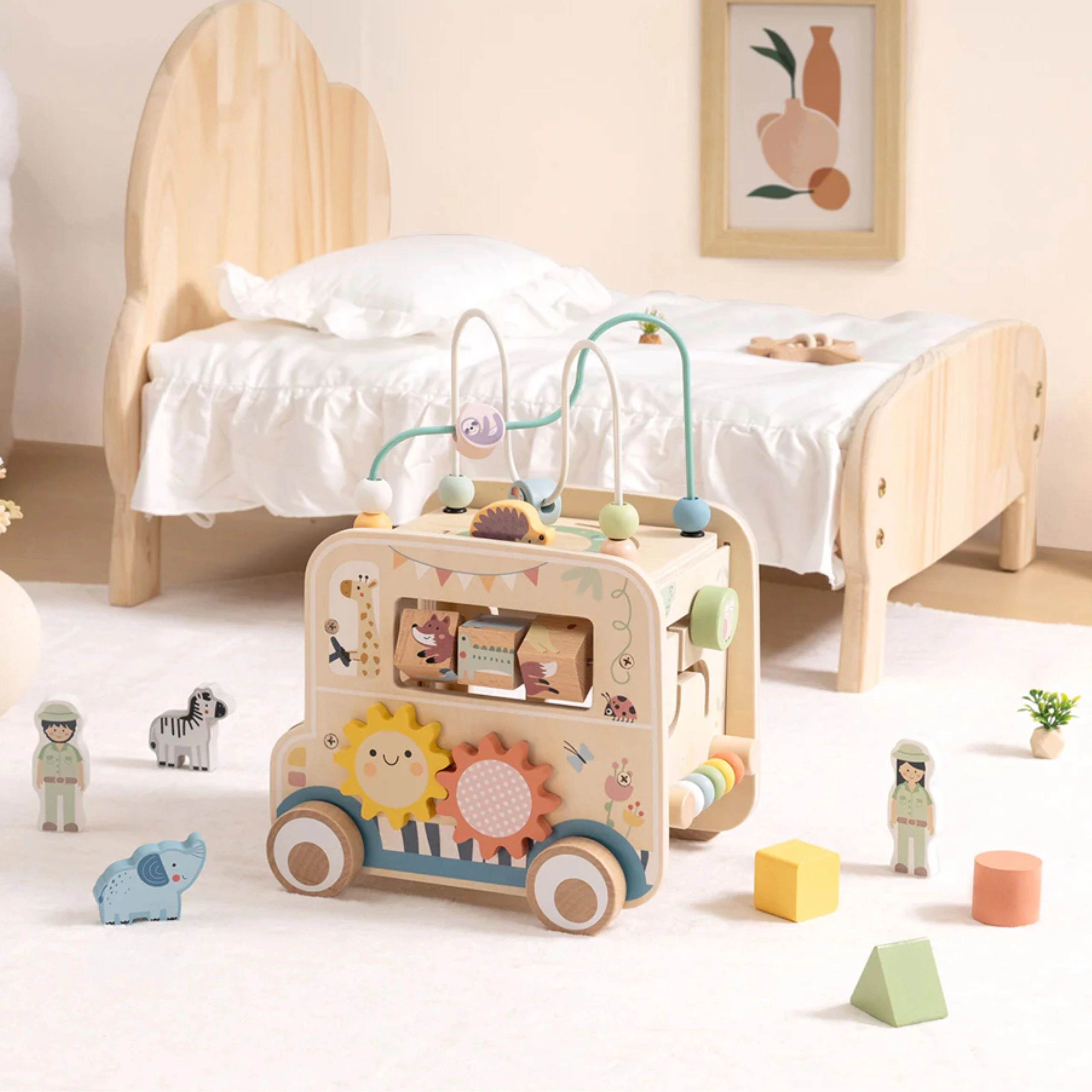 Der Holz-Aktivwürfel/Safari-Auto bietet Kindern unzählige Entdeckungsmöglichkeiten. Vom abnehmbaren Motorik-Bügel mit Perlen über Labyrinth und Zahnräder bis zu drehbaren Blöcken mit Tieren – jede Seite bietet eine neue Herausforderung. Das Design in sanften Farben und die glatte Verarbeitung sorgen für sicheres Spielen und die Förderung wichtiger Fähigkeiten.