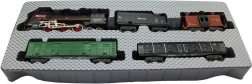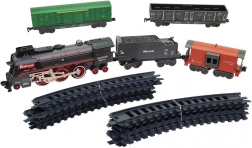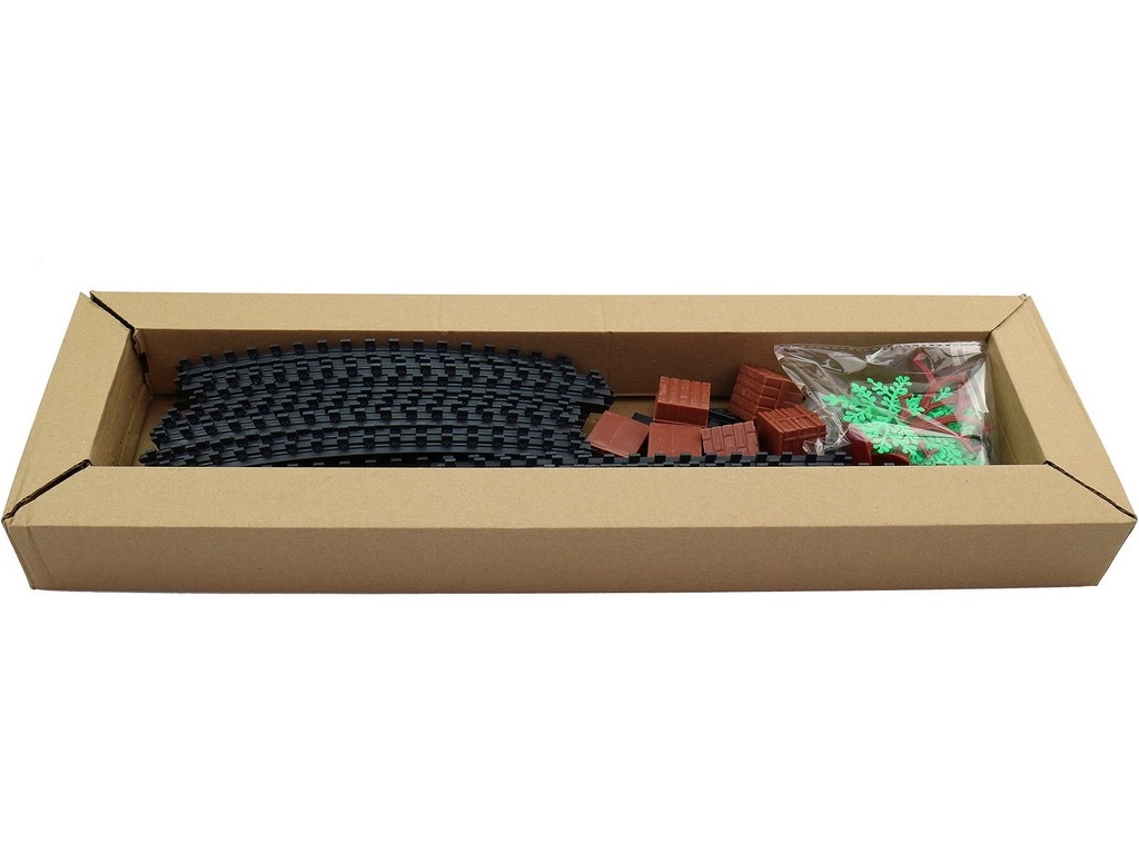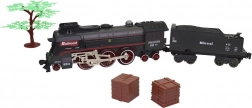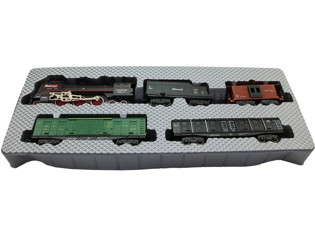 Lokomotive mit Tender und Güterwagen samt Bogengleisen bilden ein Oval von bis zu 151 × 92,5 cm.