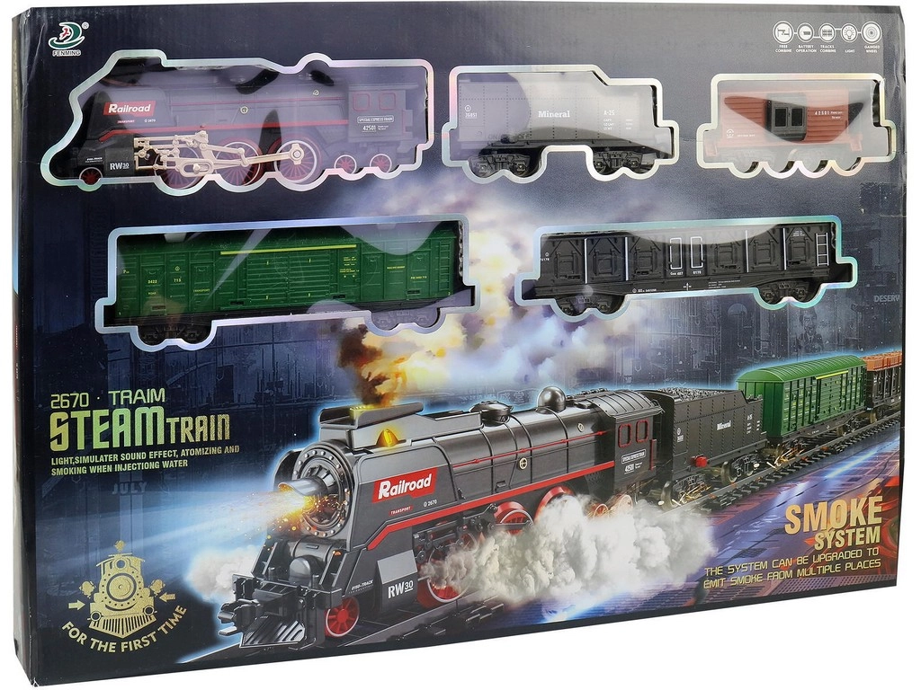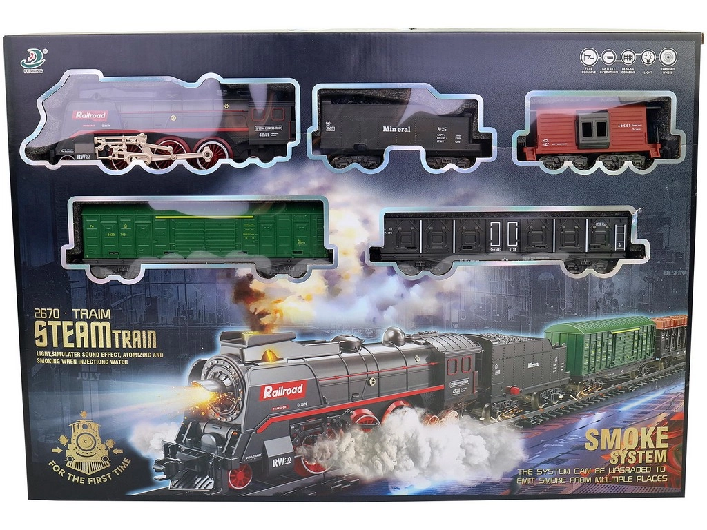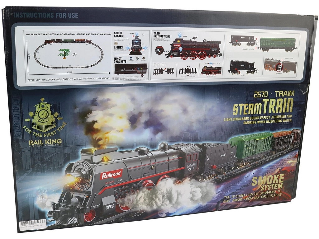 Diese Dampfeisenbahn bringt Kindern ein authentisches Fahrerlebnis – aus Schornstein und Fahrgestell steigt realistischer Dampf auf, die Lokomotive leuchtet und erzeugt Sounds einer Dampflok. Dank der einfachen Montage der Gleise bauen Sie die große ovale Strecke mit 151 × 92,5 cm im Handumdrehen auf.