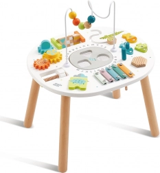Auf der Tischplatte entdecken Kinder vielfältige Stationen: ein Draht-Perlenlabyrinth, ein Xylophon mit Schlägel, drehbare Zahnräder, ein magnetisches Angelspiel, eine Formen-Einlegeaufgabe und weitere durchdachte Elemente zum Trainieren von Logik, Geduld und Koordination. Dank der vielen Aktivitäten an einem Ort bleibt die Spielecke übersichtlich und Kinder können sich leicht konzentrieren.