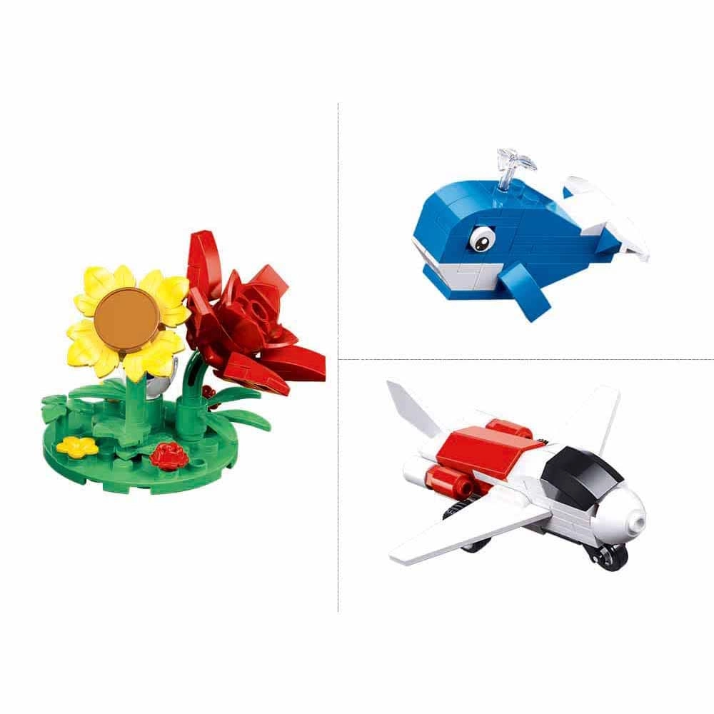 Das Sluban Builder 6-in-1 Bauset vereint Spiel und Lernen. Aus einem Set entstehen mehrere unterschiedliche Modelle – vom Flugzeug und Fahrzeugen bis hin zu Kaninchen, Blumen oder kleinen Szenen. Dank der Kompatibilität mit LEGO, COBI und Mega Bloks erweitern Sie Ihre Bauten ganz einfach und fügen neue Ideen hinzu.