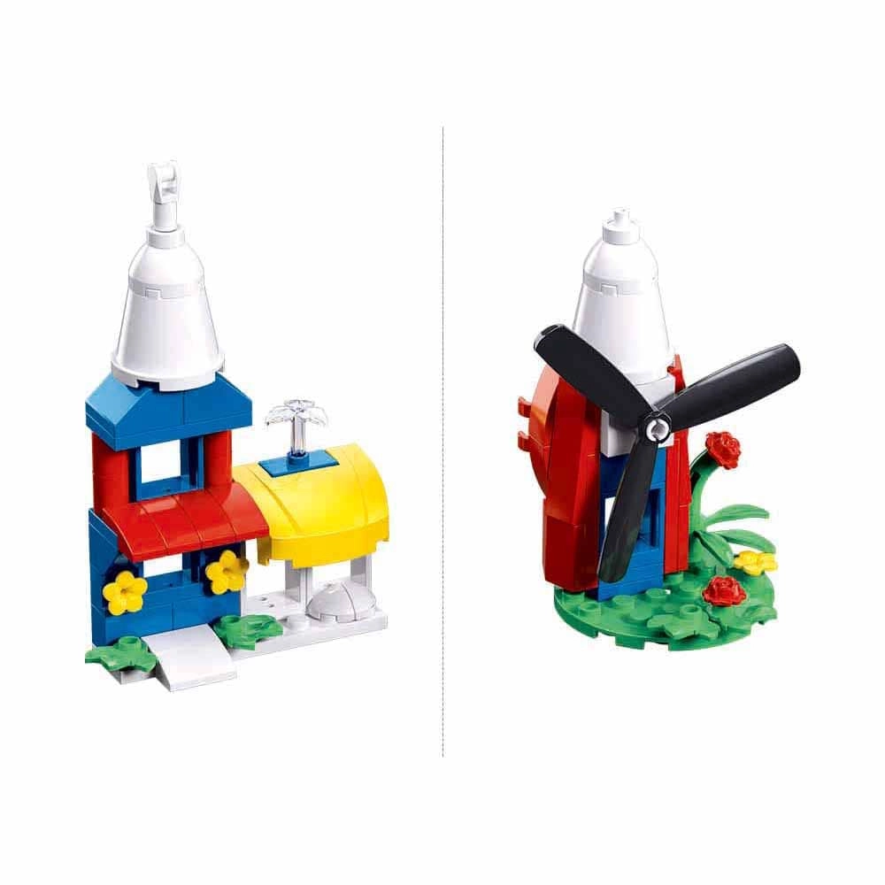 Aus einem Set entstehen vielfältige Modelle – ein Häuschen mit Blumen oder eine Windmühle mit drehbaren Flügeln. Kreativer Spielspaß, der nicht langweilig wird.