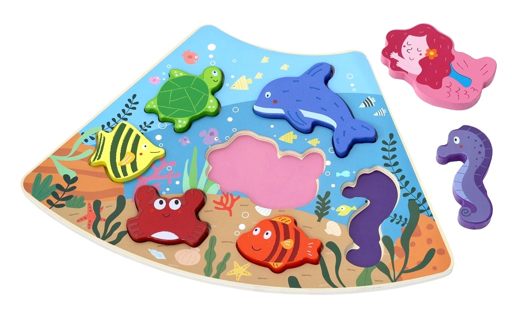 Entdecken Sie die Magie des Ozeans mit einer robusten Holzplatte und 7 verschiedenen Teilen – Schildkröte, Delfin, Meerjungfrau, Seepferdchen, Krabbe und weitere Fische. Dank der dicken, glatten Teile liegt das Puzzle auch den Kleinsten gut in der Hand und hilft ihnen, Formenwahrnehmung und Geduld zu trainieren.