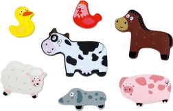 Sieben massive Tiere mit beliebten Bauernhofmotiven unterstützen einen sicheren Griff und trainieren die Koordination beim Einsetzen in die richtigen Formen.