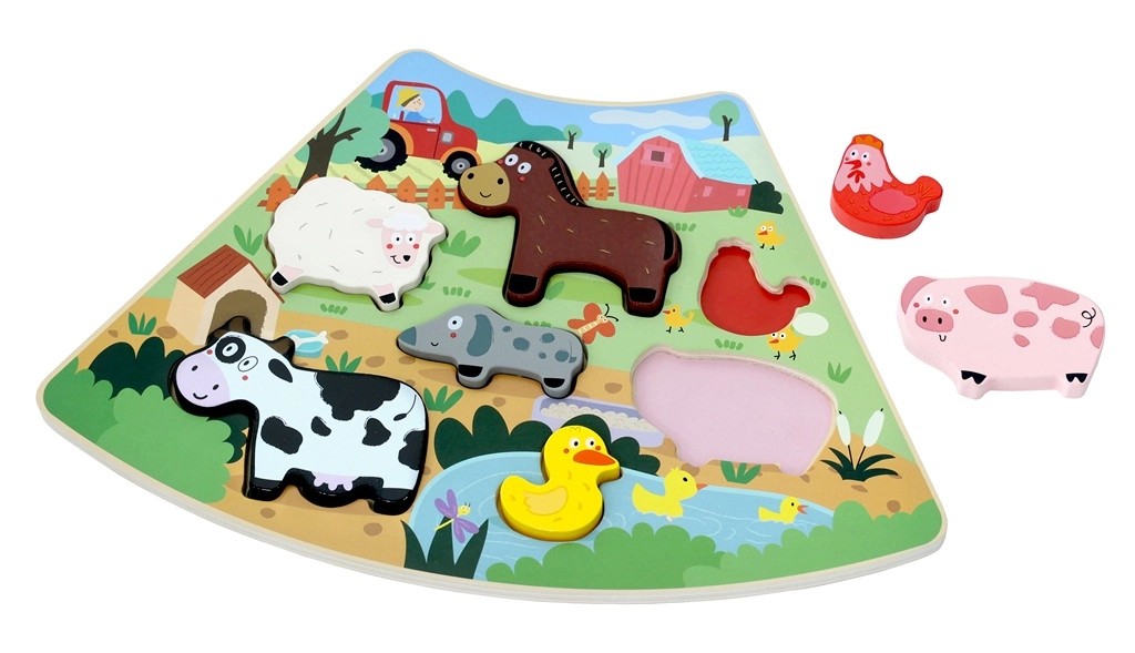 Das Holzpuzzle „Fröhlicher Bauernhof“ bietet eine stabile Grundplatte mit farbiger Bauernhof-Illustration und 7 massive, abgerundete Tierteile (Kuh, Schaf, Pferd, Schwein, Hund, Ente, Henne). Die kräftigen Teile liegen gut in kleinen Händen und passen exakt in die gefrästen Aussparungen – ideal zur natürlichen Förderung von Feinmotorik und Konzentration.