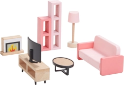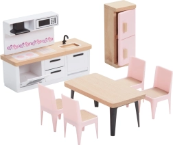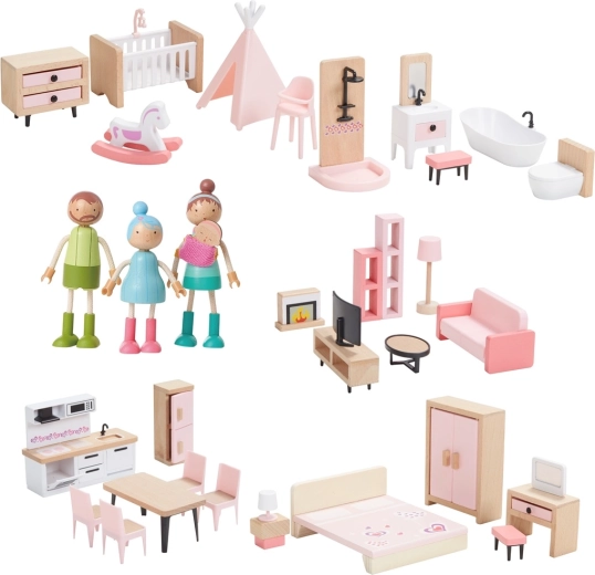 Dieses vielseitige Puppenhaus-Möbelset bietet alles, was Kinder brauchen, um ein gemütliches Zuhause für ihre Figuren zu gestalten. Enthalten ist die Ausstattung für Schlafzimmer, Küche, Wohnzimmer, Bad und Kinderzimmer in einer harmonischen Kombination aus naturbelassenem Holz und zarten Rosé-Akzenten. Dazu kommt die ganze Familie mit biegsamen Gliedern für authentische Szenen und Rollenspiele.
