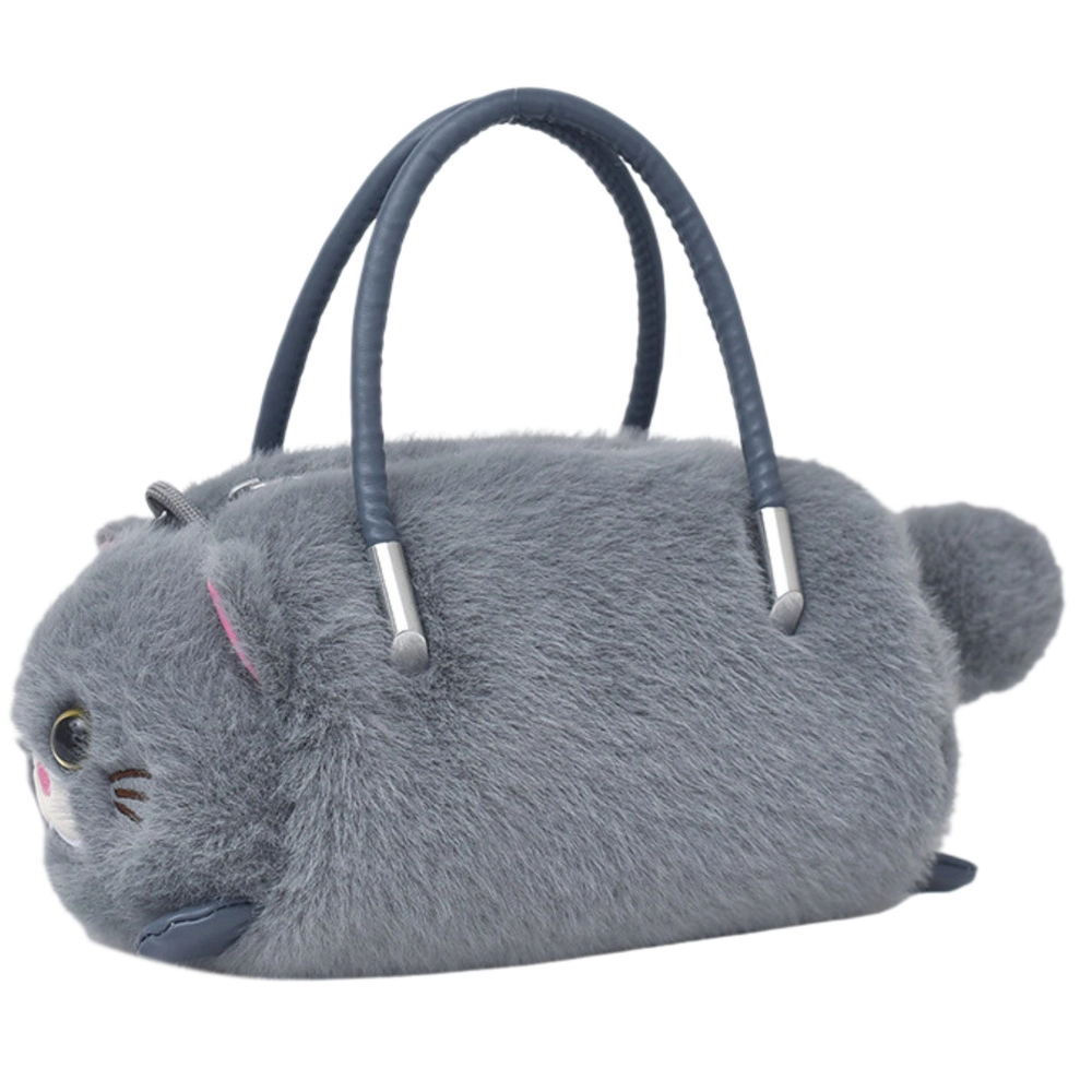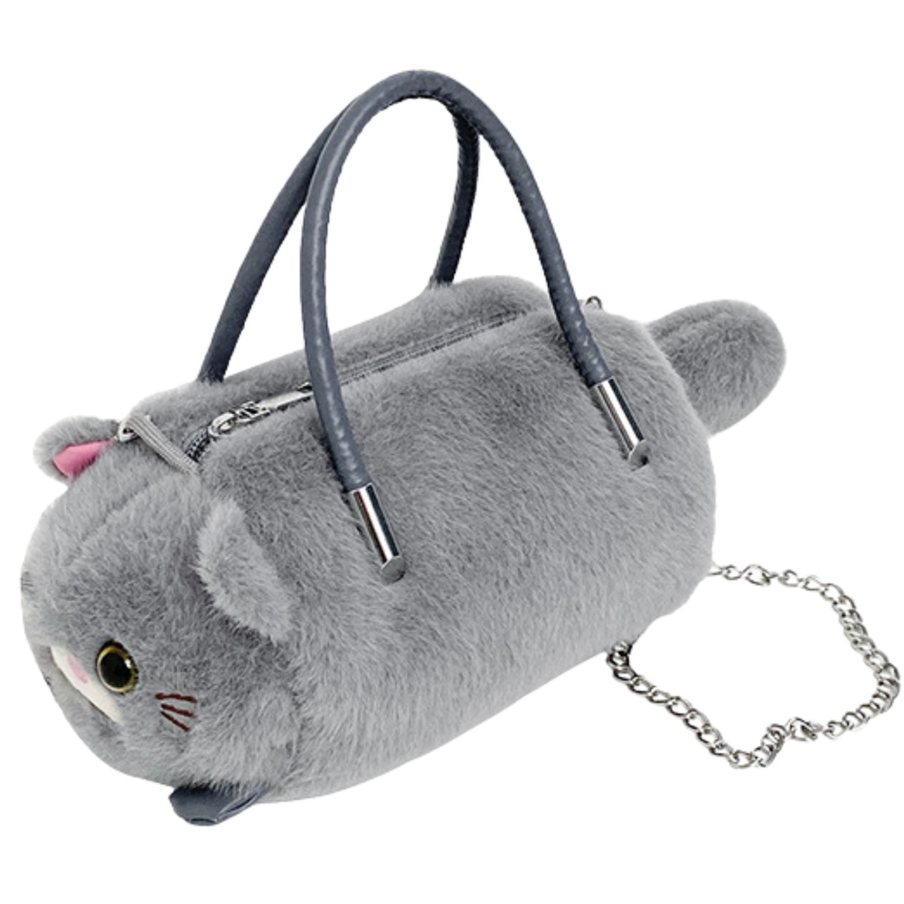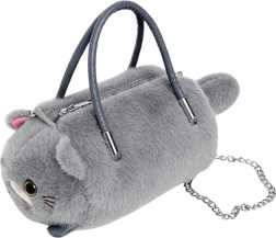 Plüsch-Handtasche in Katzenform, grau mit Griffen und Kette