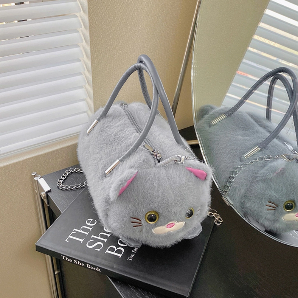 Die niedliche graue Handtasche in Katzenform verbindet kuschelweichen Plüsch mit praktischem Design. Sie hat zwei stabile Griffe, eine abnehmbare Metallkette zum Tragen über der Schulter und einen sicheren Reißverschluss. Ideal für Kleinigkeiten – für Kinder, Teenies und Erwachsene, die originelle Accessoires lieben.