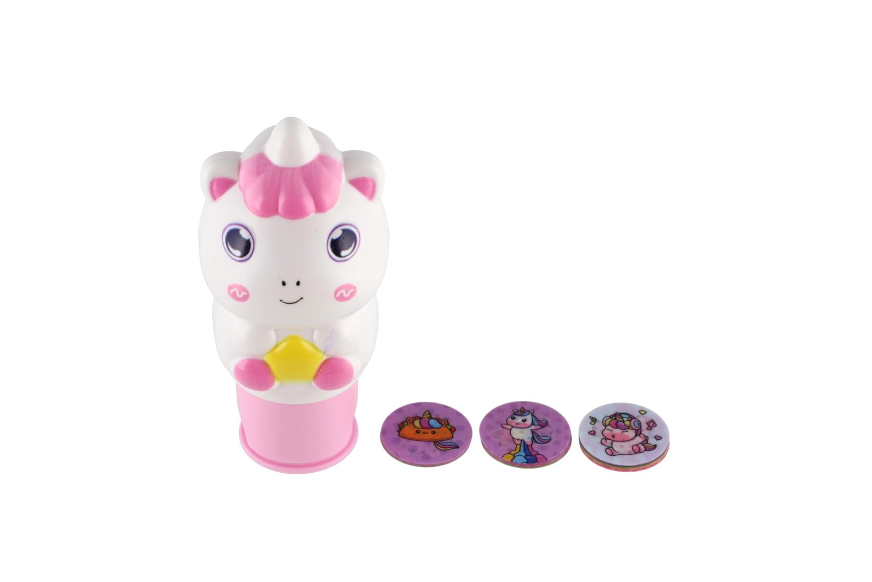 Dieses besondere Aufkleber-Stempel mit Einhornmotiv bietet Kindern stundenlangen Spaß. Die kompakte Form passt in kleine Hände, austauschbare Motivscheiben ermöglichen abwechslungsreiche Abdrücke und das niedliche Design motiviert zum Gestalten. Ideal zum Verzieren von Heften, Tagebüchern, Karten oder Geschenkverpackungen.