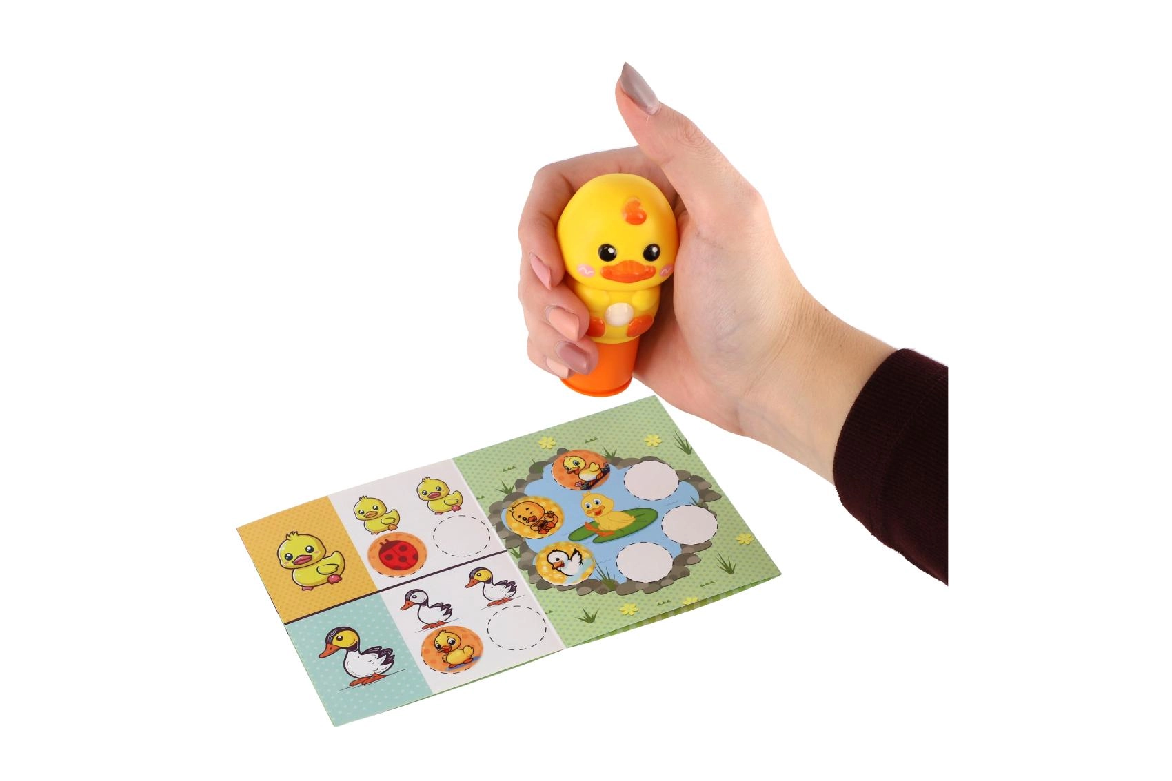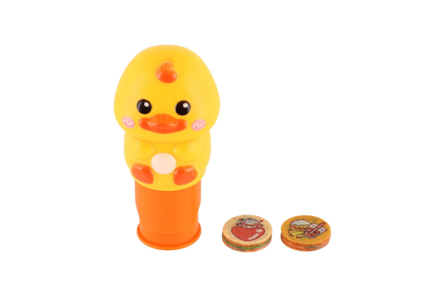 Entdecken Sie den spielerischen Stempel in Form eines gelben Entchens, der jedes Bastelprojekt in Freude verwandelt. Dank des bequemen Griffs und des sauberen Abdrucks ist der Stempel ideal für kleine Kinderhände. Zusätzlich enthält das Set runde Aufkleber mit verschiedenen Entchenmotiven und einen thematischen Bogen, auf den Kinder die Aufkleber kleben können.
