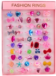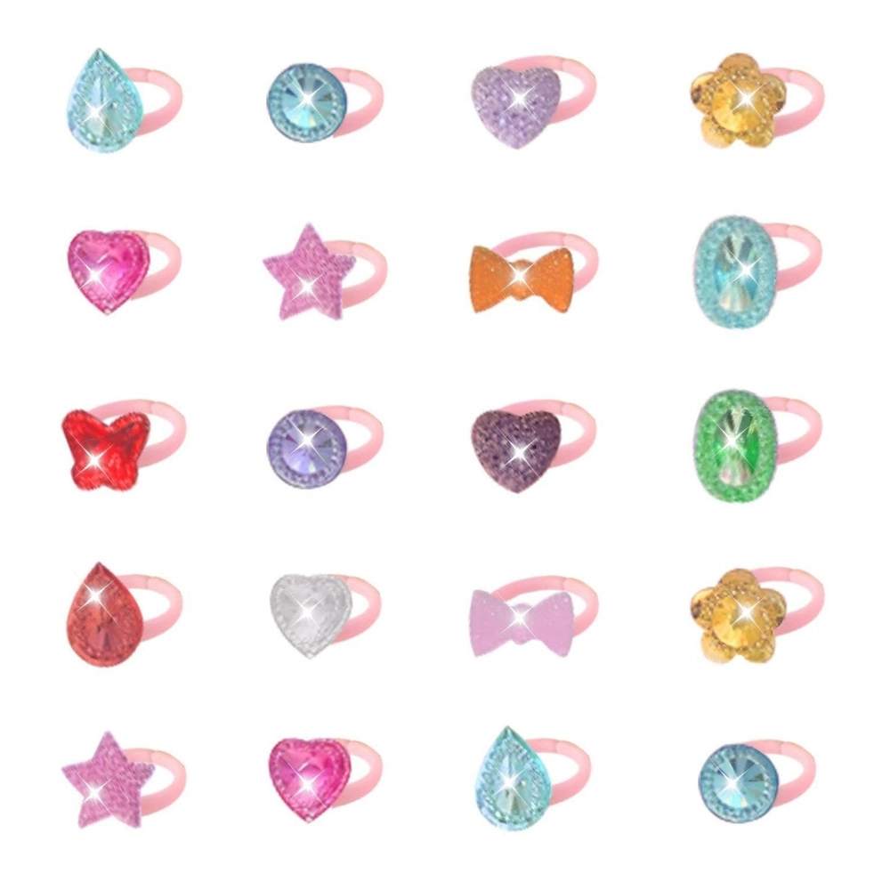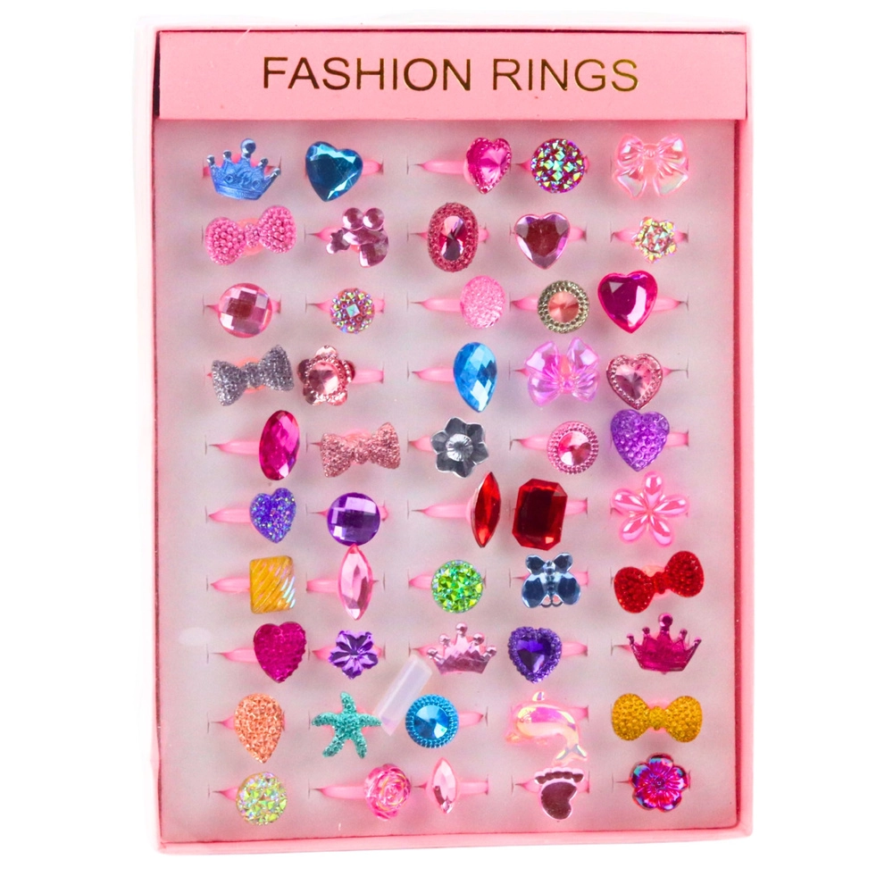 Spielset voller Fantasie: 50 bunte Ringe mit Motiven wie Herzchen, Sternchen, Kronen, Schleifchen, Blümchen und großen „Kristallen“ erfreuen jede kleine Schmuckliebhaberin. Glänzende facettierte Steine reflektieren das Licht wunderschön und verleihen jedem Kostüm und dem Alltagsspiel einen besonderen Glitzereffekt.