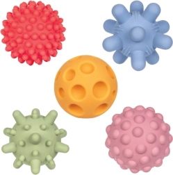 Das Set aus fünf weichen, sensorischen Bällen in Pastellfarben ist für die Kleinsten ab 0+ konzipiert. Jeder Ball hat eine andere Textur für reichhaltige taktile Reize – von feinen Erhebungen bis zu markanteren Noppen. Dank der lochlosen Konstruktion sammeln sich innen weder Wasser noch Schmutz, was hygienisch ist und die Nutzung in der Badewanne ermöglicht.