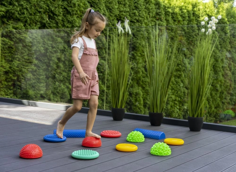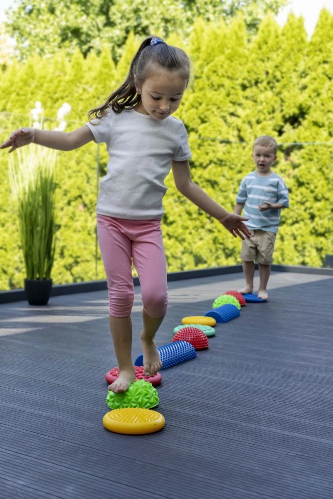 Der sensorische Pfad mit 11 farbigen Elementen kombiniert Kuppeln, Discs und Halbwalzen mit unterschiedlichen Texturen für ein abwechslungsreiches Training. Kinder können von „Stein“ zu „Stein“ springen, die Stabilität der Sprunggelenke, die gesamte Körperhaltung und die Grobmotorik entwickeln; Erwachsene nutzen ihn für aktives Gleichgewichtstraining und Fußmassage.