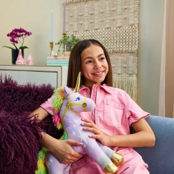 Der kuschelweiche lila Stoff, die regenbogenfarbene Mähne und der Schweif sowie goldene Akzente sorgen für einen hochwertigen Look und ein angenehmes Gefühl beim Kuscheln.