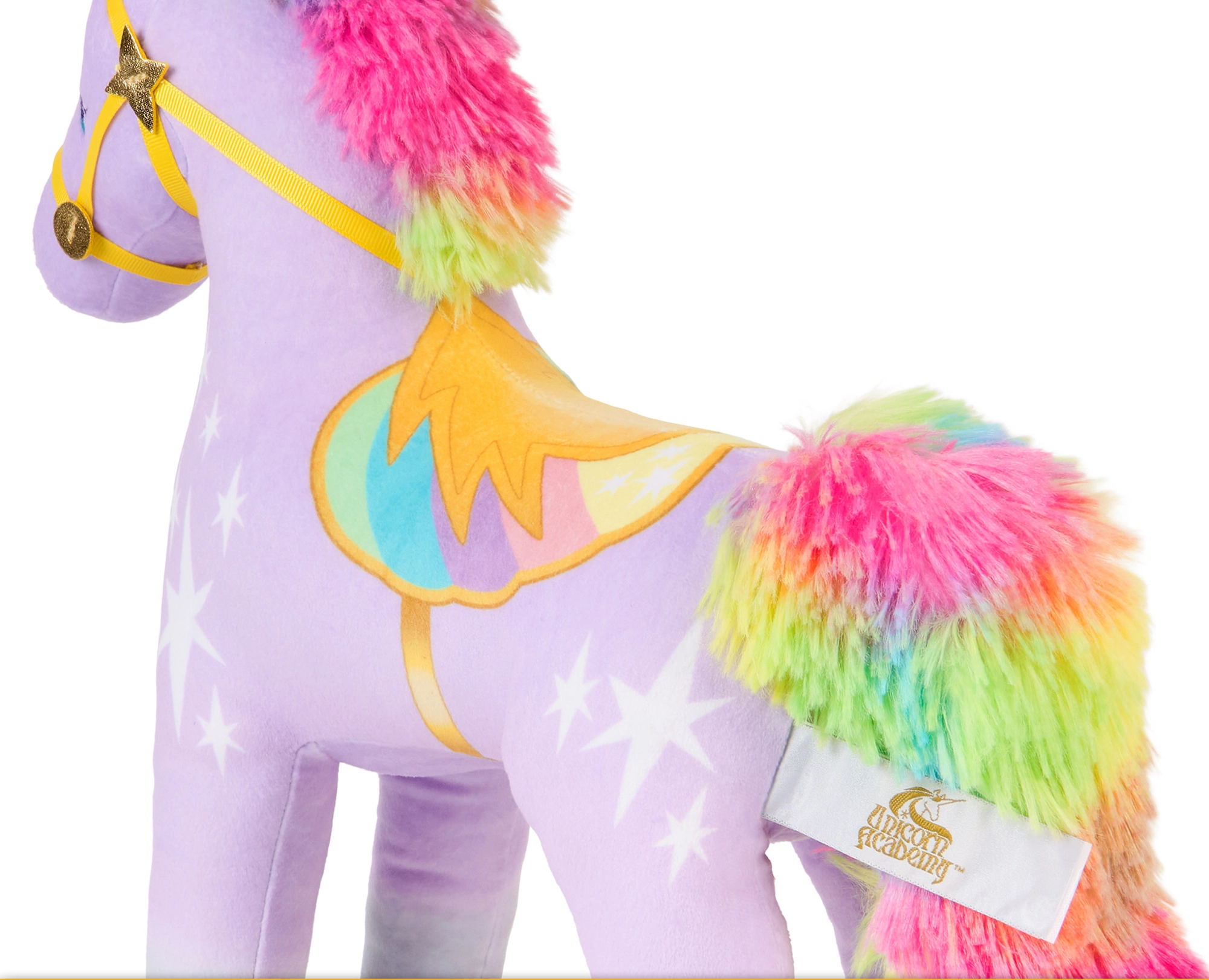 Entdecken Sie die magische Welt von UNICORN ACADEMY mit dem Plüscheinhorn WILDSTAR. Dieses kuschelweiche Spielzeug mit einer Höhe von 35 cm verfügt über Lichteffekte am Horn und am Körper sowie über passende Klänge. Dank weichem lila Plüsch, regenbogenfarbener Mähne und Schweif sowie goldenen Details ist es ideal zum Kuscheln und für kreatives Spielen.