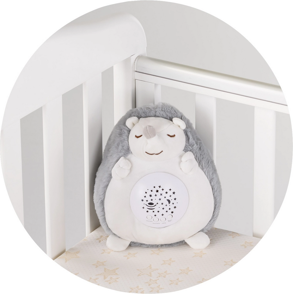 Der anschmiegsame Plüsch-Igel schafft dank des farbigen LED-Projektors mit Kombinationen aus Rot, Grün und Blau eine ruhige Stimmung vor dem Schlafengehen. Die Farben wechseln sanft und projizieren Sternchen im Raum. Wählen Sie aus 10 Schlafliedern oder 5 Arten von Weißem Rauschen (z. B. Herzschlag, Rauschen) und passen Sie das Abendritual der aktuellen Stimmung Ihres Kindes an.