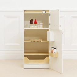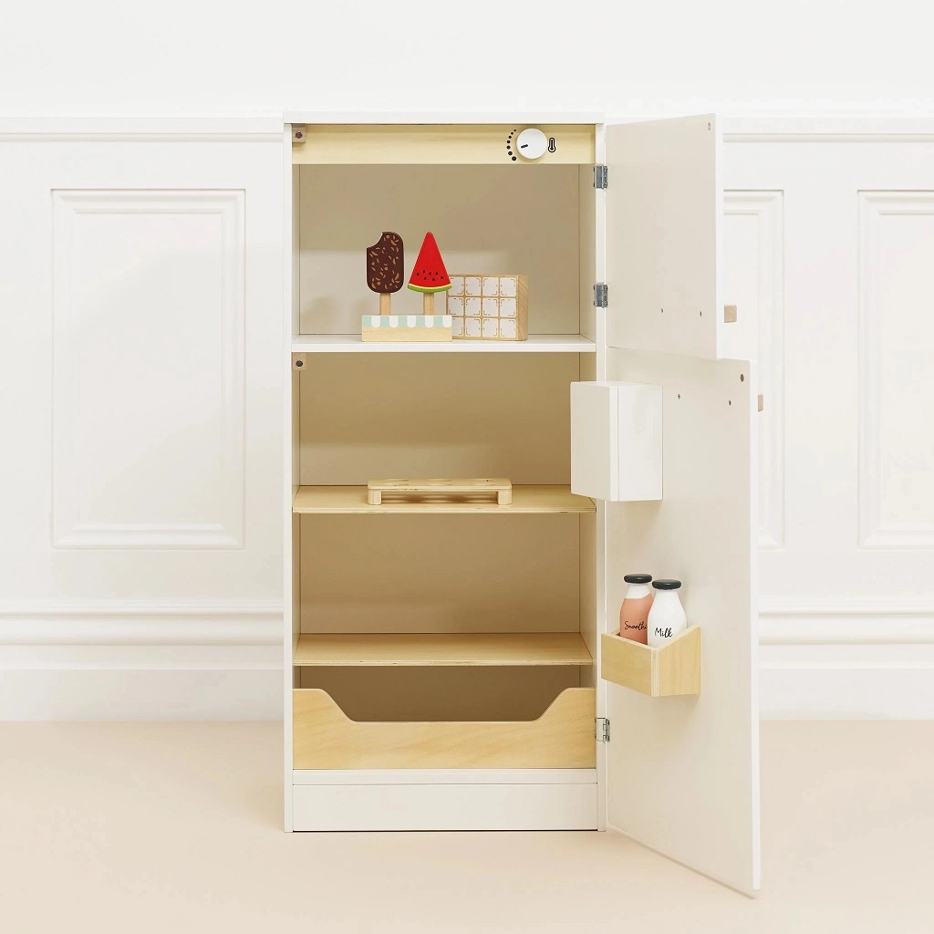 Dieser freistehende Kinderkühlschrank mit Gefrierfach bringt authentisches Küchen-Feeling in jedes Spielzimmer. Retro-Design, stabile Holzkonstruktion und durchdachte Details fördern Rollenspiele sowie die Feinmotorik. Der Kühlschrank ist mit der großen LE TOY VAN Küche kompatibel und dank magnetischer Türen und Zubehör macht er Kindern stundenlang Spaß.