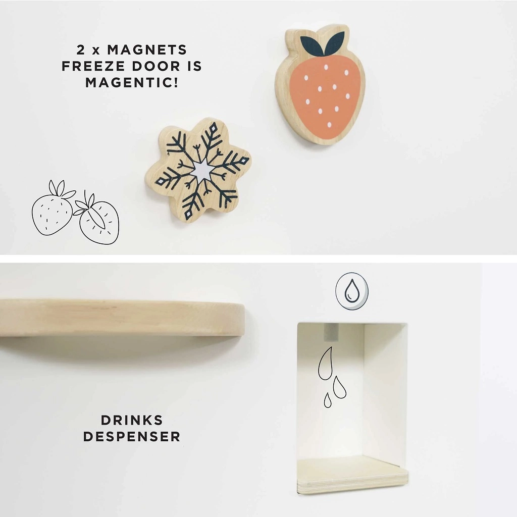 Im Set ist alles enthalten, was kleine Köche brauchen: 2 Eis am Stiel, Ständer, Eierablage, Eiswürfelform, 2 Flaschen und dekorative Magnete. Materialien mit FSC-Zertifikat und ungiftige, wasserbasierte Farben garantieren sicheres und nachhaltiges Spielen.