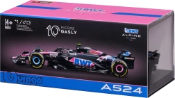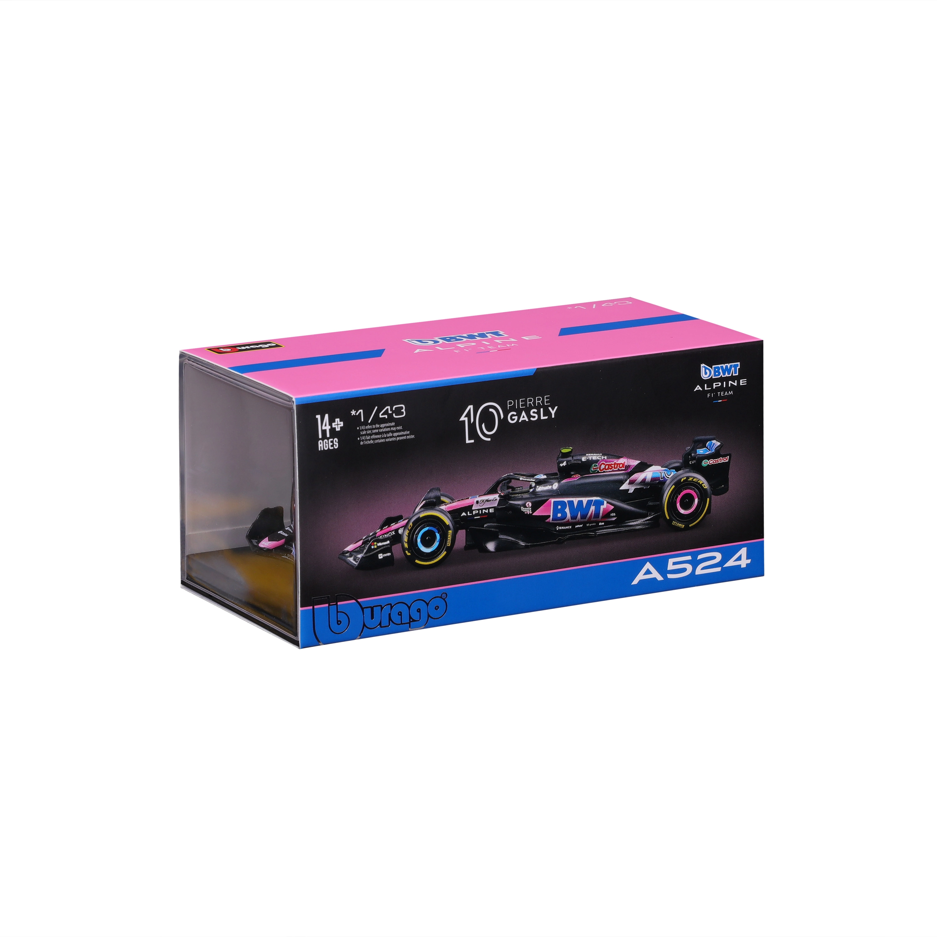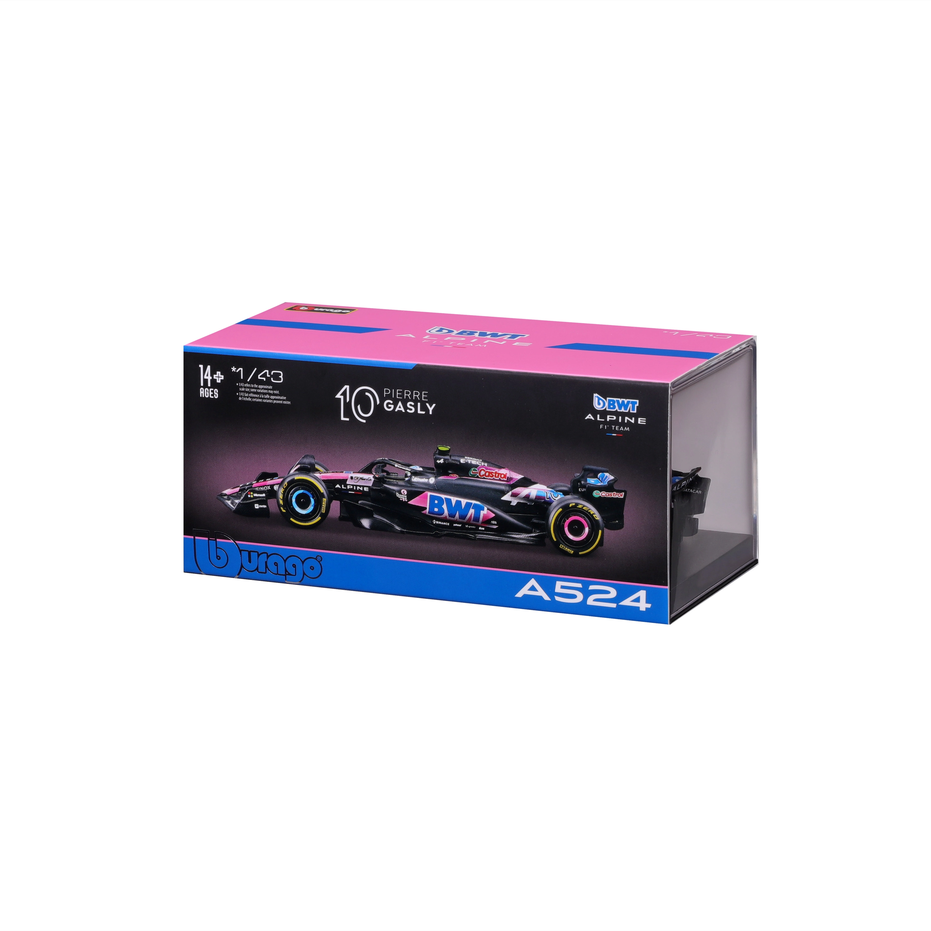 Sammel-Metallmodell des Fahrzeugs ALPINE A524 F1 2024 im Maßstab 1:43 von Bburago mit authentischer Ausführung des Monoposto #10 von Pierre Gasly, präzisen Sponsoren-Decals und frei drehbaren Rädern. Ideal für die Vitrine oder als Geschenk in einer transparenten dekorativen Box.