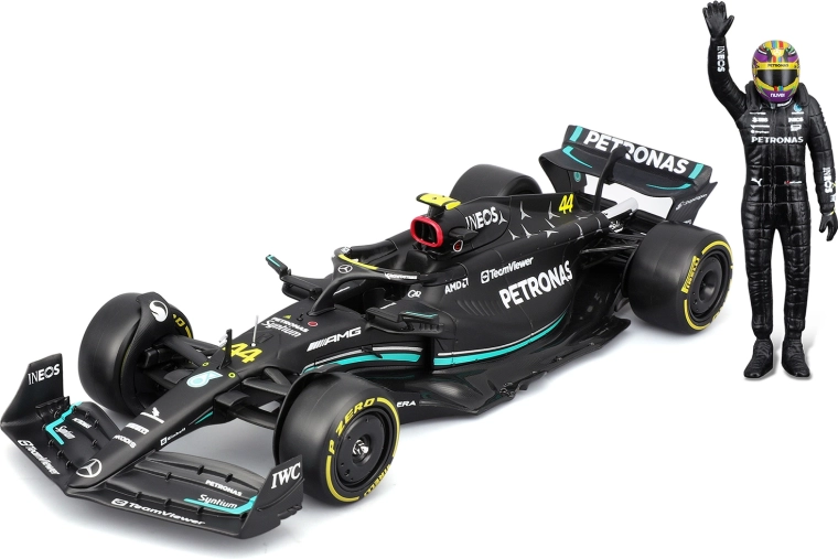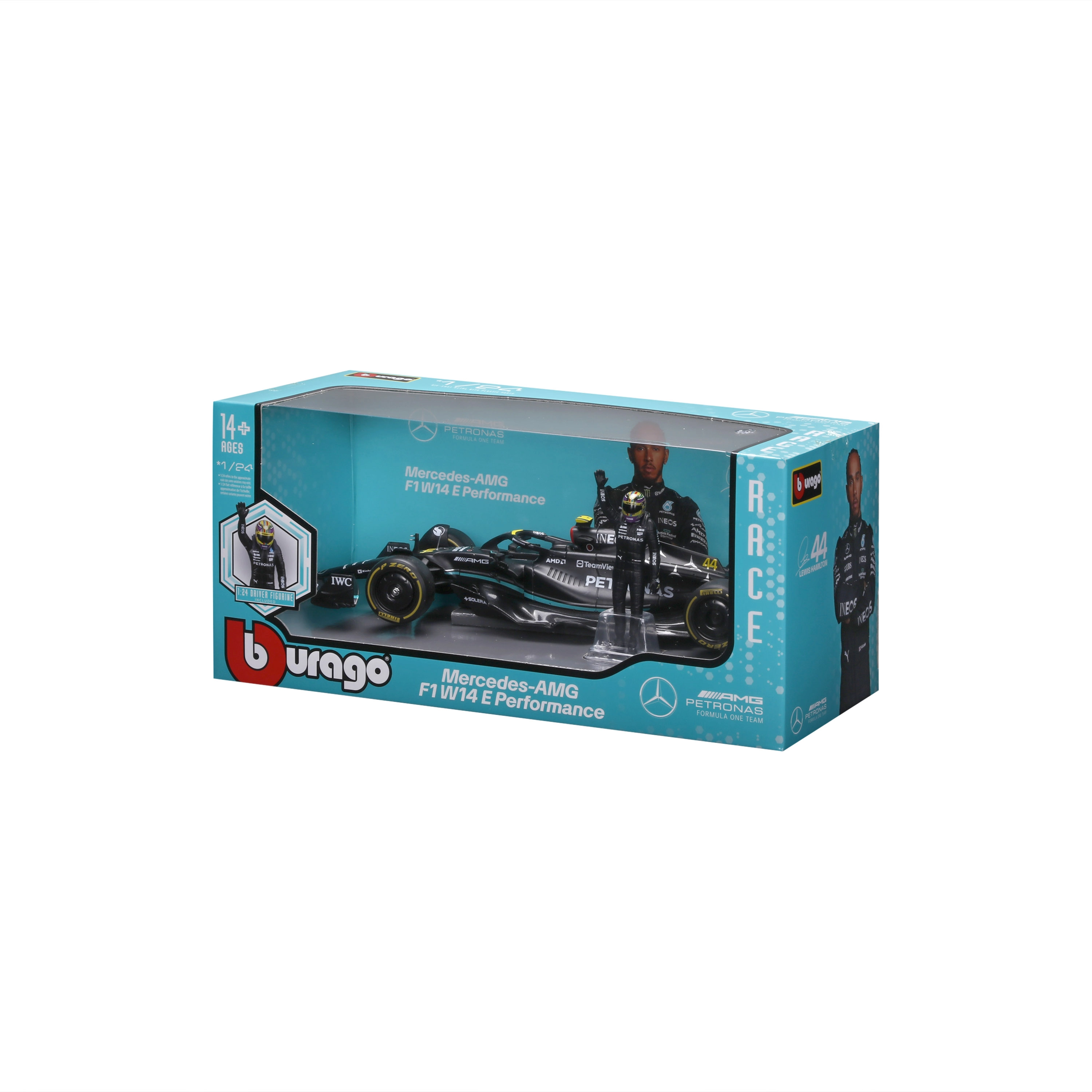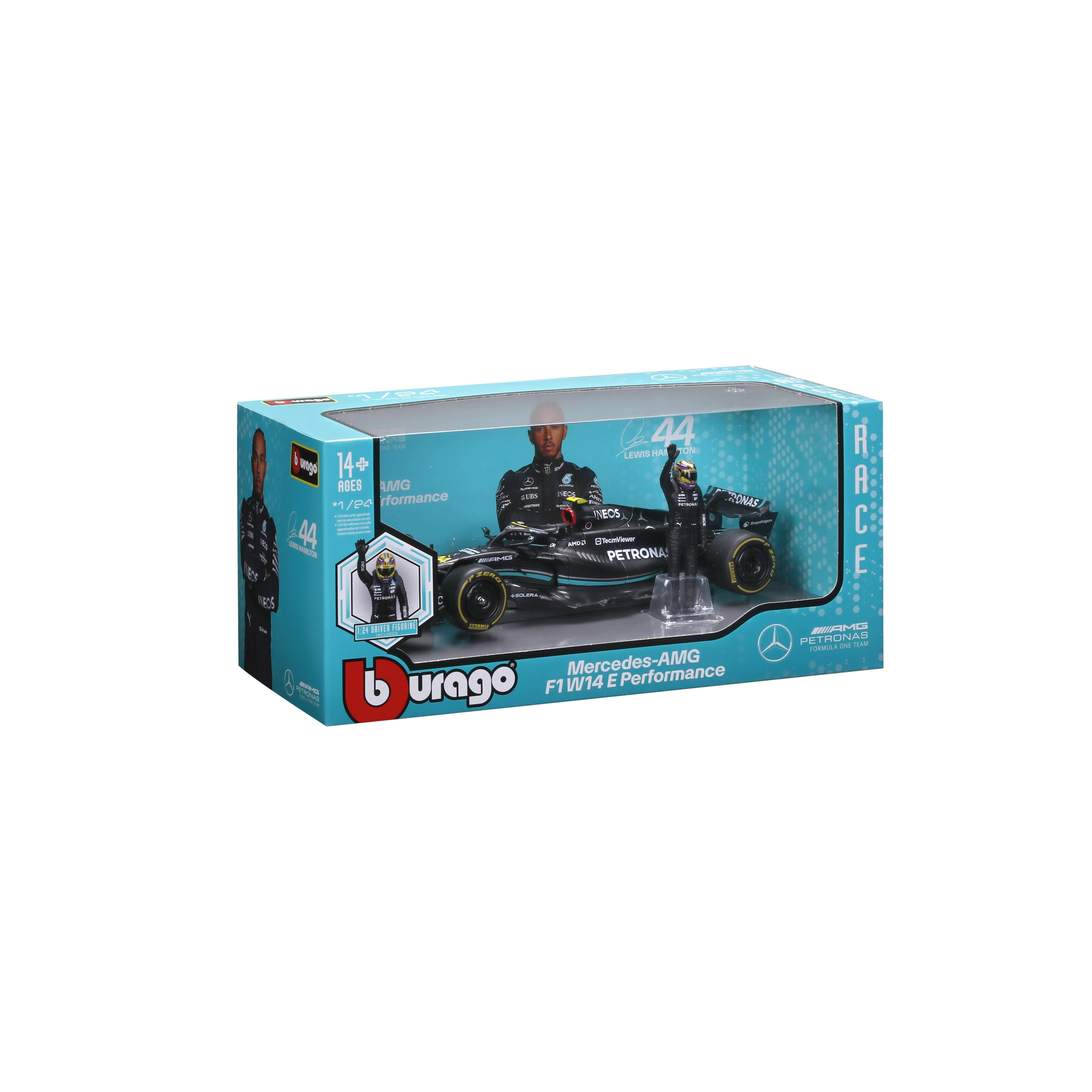 Erleben Sie die Atmosphäre der Formel 1 mit dem präzise gefertigten Modell MERCEDES-AMG PETRONAS F1 W14 E in den Farben der Saison 2023. Die originalgetreue Karosserie mit der Startnummer 44, komplexe Aero-Elemente, realistische Reifen und authentische Decal-Grafik machen ihn zu einem eindrucksvollen Stück für jede Sammlung. Ebenfalls enthalten: eine Fahrerfigur für eine effektvolle Präsentation.