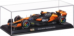 Die robuste Acrylvitrine mit der Beschriftung „McLaren MCL38 – Miami Grand Prix 2024“ sorgt für sichere Präsentation und Staubschutz. Dank der drehbaren Räder und der präzisen Lackierung wirkt das Modell außergewöhnlich realistisch und ist ideal für Motorsport-Fans sowie als Geschenkverpackung.