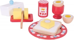 Servieren Sie ein ausgewogenes Frühstück mit diesem bunten Holzset, das ein Ei, Brot, Butter und Marmelade enthält. Das Set wird mit einem Holzmesser, einem Eierbecher, einem Teller und einer Butterdose geliefert.