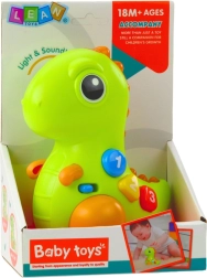 Der interaktive Dinosaurier begeistert Kinder auf den ersten Blick: Beim Drücken der farbigen Tasten leuchtet er, spielt Melodien ab und gibt fröhliche Geräusche von sich. Ein sanftes Tippen auf die Nase startet Musik und Bewegung – so wird das Verständnis des Zusammenhangs zwischen Berührung und Reaktion des Spielzeugs gefördert – eine großartige Grundlage für spielerisches Lernen.