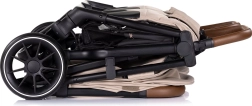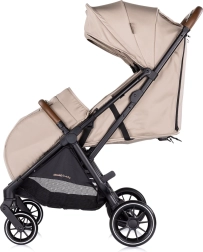 Für Sicherheit sorgen Fünfpunktgurte mit weicher Polsterung und abnehmbare Frontbügel mit Kunstlederbezug. Gefederte, leicht abnehmbare Räder und die Hinterradbremse gewährleisten eine stabile, sanfte Fahrt selbst im urbanen Gelände. Die praktische Ausstattung umfasst einen großen Stauraumkorb, gepolsterte Fußdecken, einen Getränkehalter sowie eine Tasche mit Wickelunterlage für schnelles Wickeln unterwegs.